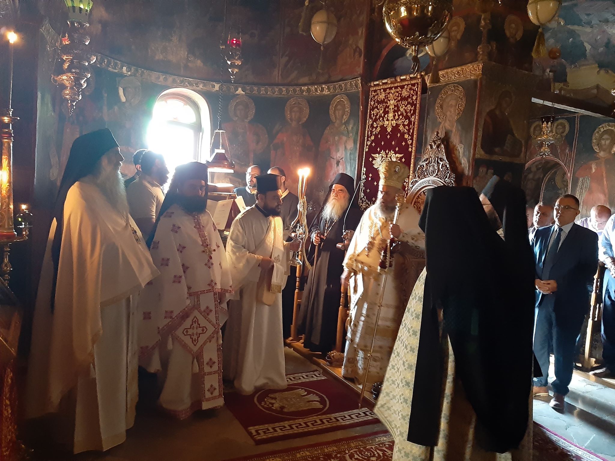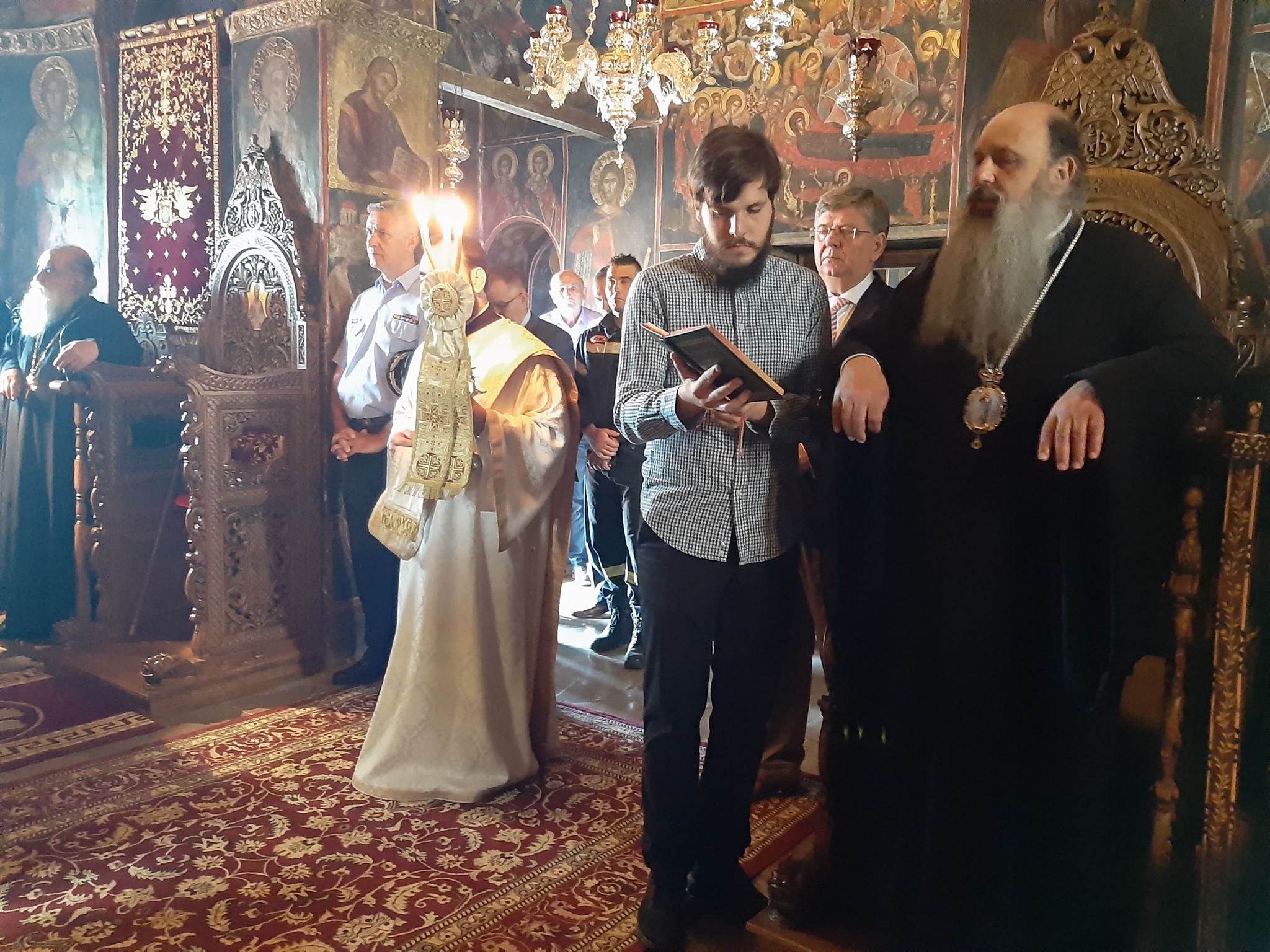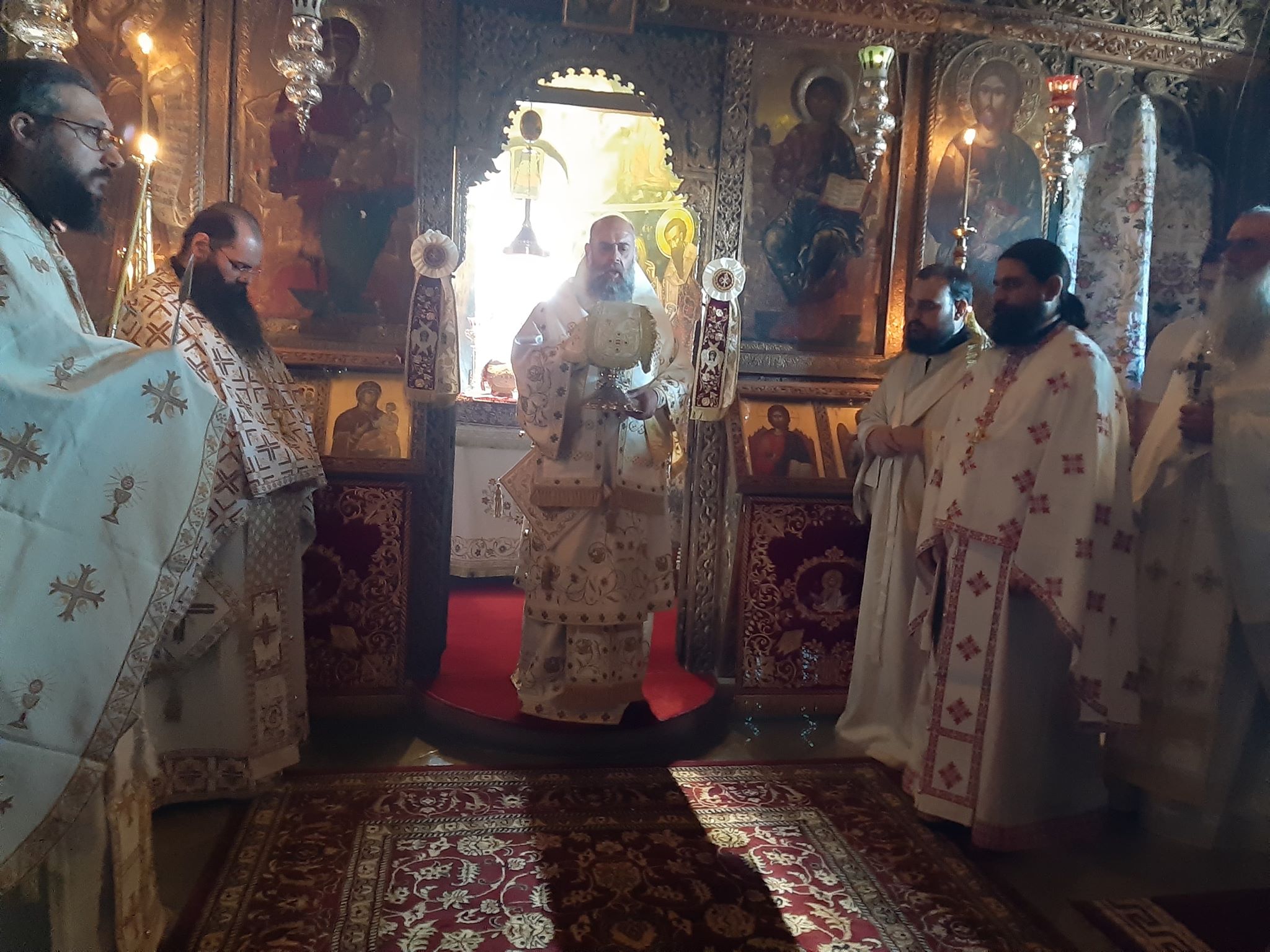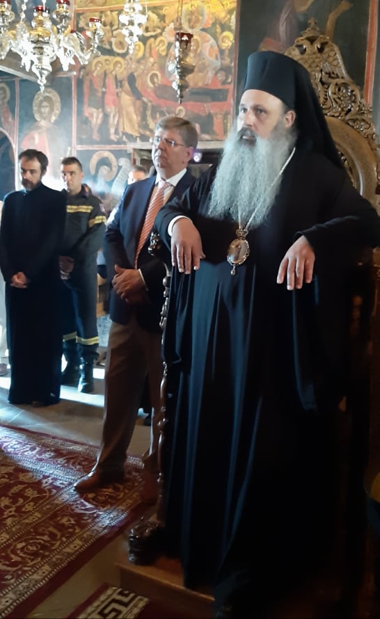 Με το πέρας της Θείας Λειτουργίας ο κ. Τιμόθεος ξεναγήθηκε στο σκευοφυλάκιο της Μονής όπου φυλάσσονται θησαυροί αιώνων, από τον υπεύθυνο αυτού Αλέξανδρο Σχορτσιανίτη.