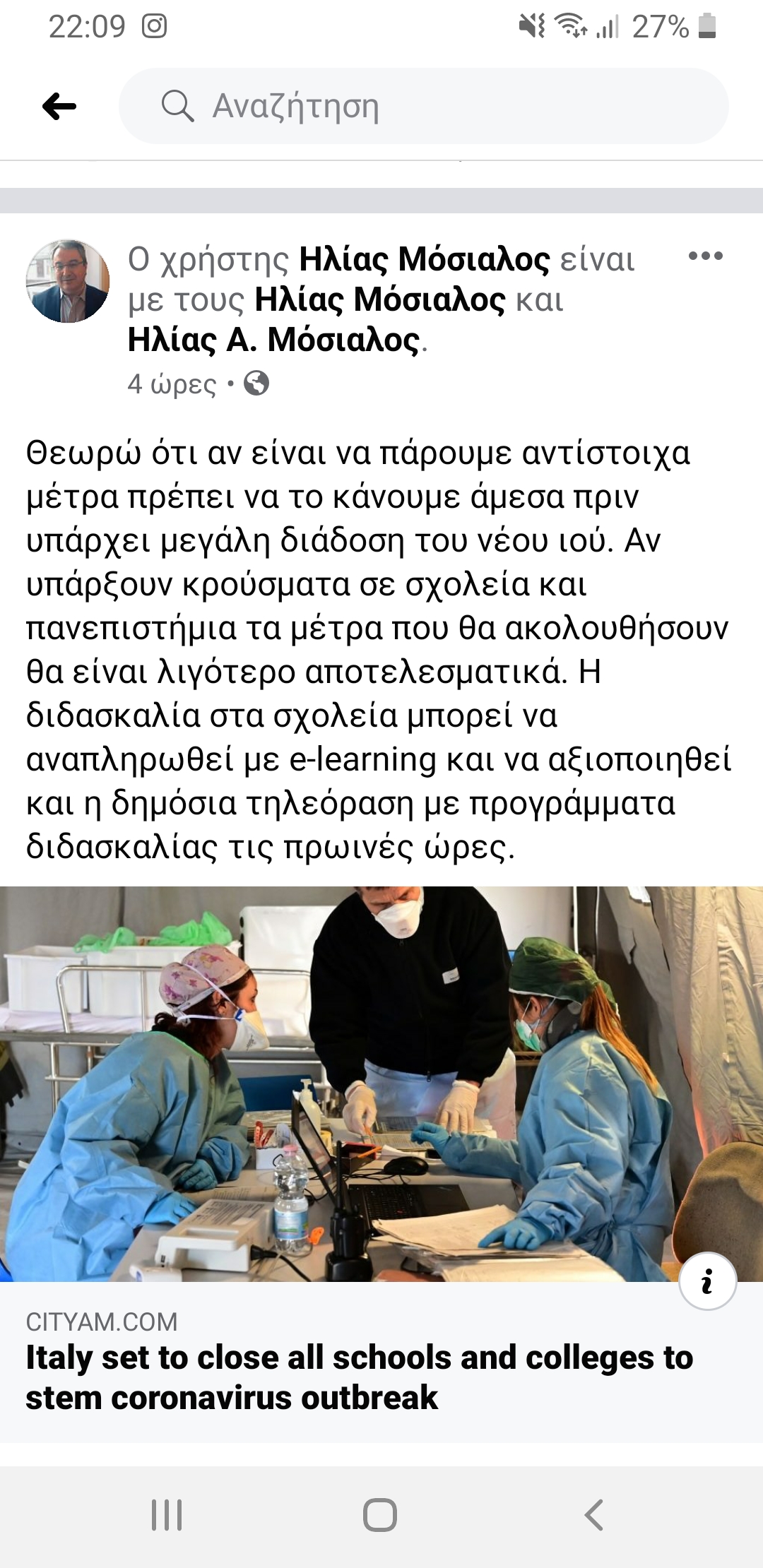 Συγκεκριμένα σε ανάρτησή του, με επισύναψη αντίστοιχου δημοσιεύματος στην Ιταλία, ο Ηλίας Μόσιαλος αναφέρει: