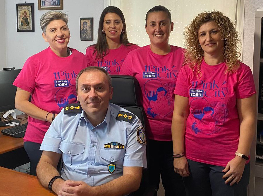 Στη φωτό παραπάνω διακρίνεται ο αστυνομικός υποδιευθυντής, Διοικητής του Α.Τ. Τρικάλων, Σωτήρης Δημοθόδωρος πλαισιούμενος από συναδέλφους του αστυνομικίνες ντυμένες με ροζ μπλουζάκια που φέρουν το σχετικό μήνυμα.