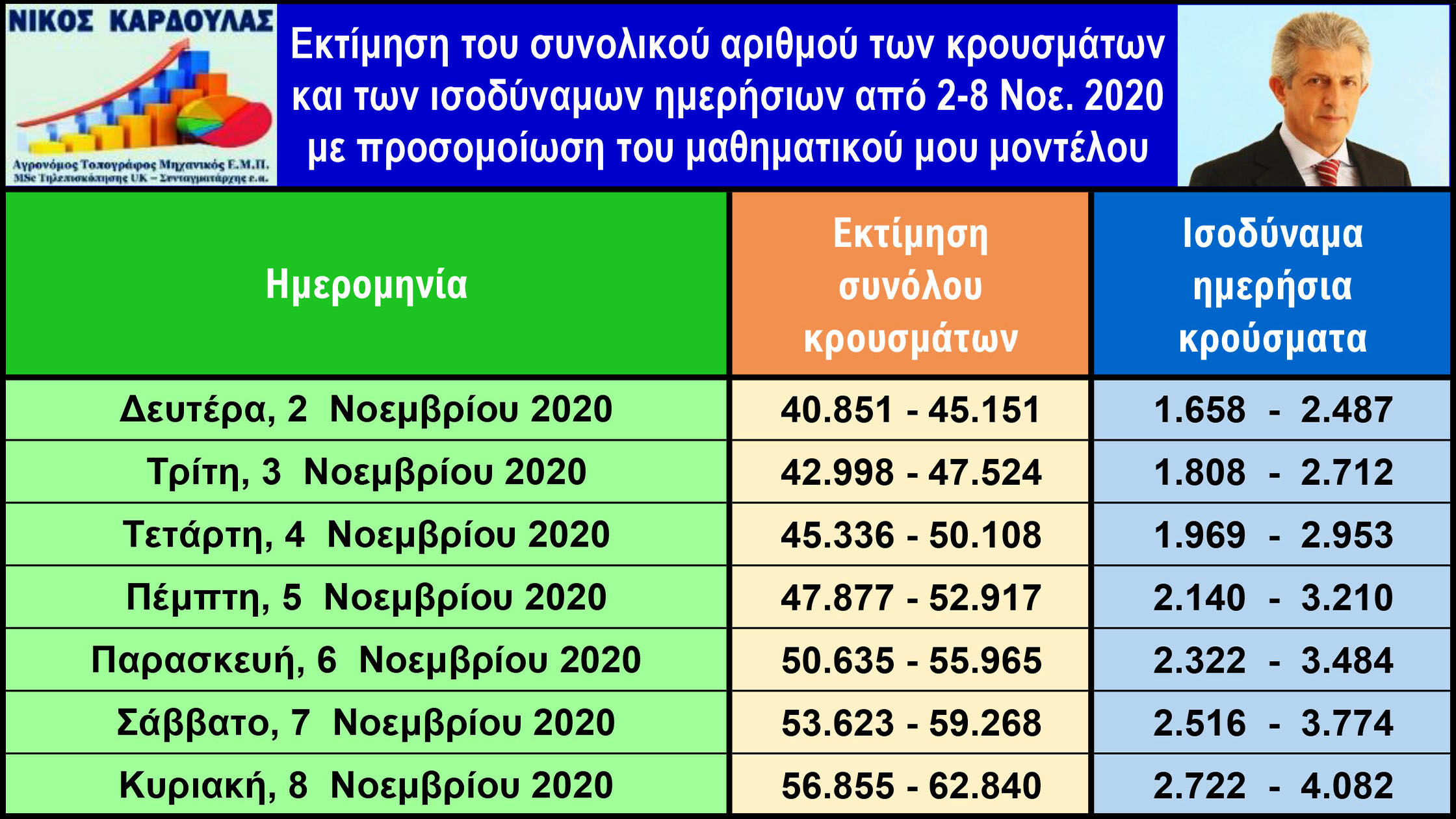 Πραγματοποιήθηκε λοιπόν νέα προσομοίωση του μοντέλου στις 1 Νοεμβρίου, λαμβάνοντας υπόψη τις ημερήσιες τιμές του αθροίσματος των κρουσμάτων από την αρχή της πανδημίας, που δημοσιεύονται από τον ΕΟΔΥ και έγιναν προβλέψεις του ημερήσιου αθροίσματος των κρουσμάτων για την εβδομάδα 2 έως 8 Νοεμβρίου με ακρίβεια ±5%. Στην συνέχεια από τις τιμές των αθροισμάτων υπολογίσθηκαν τα ισοδύναμα ημερήσια κρούσματα για την ίδια εβδομάδα.