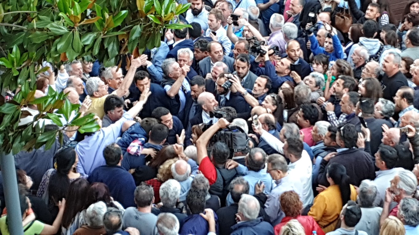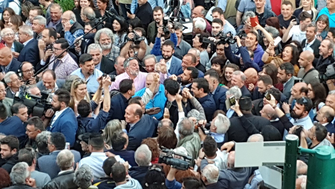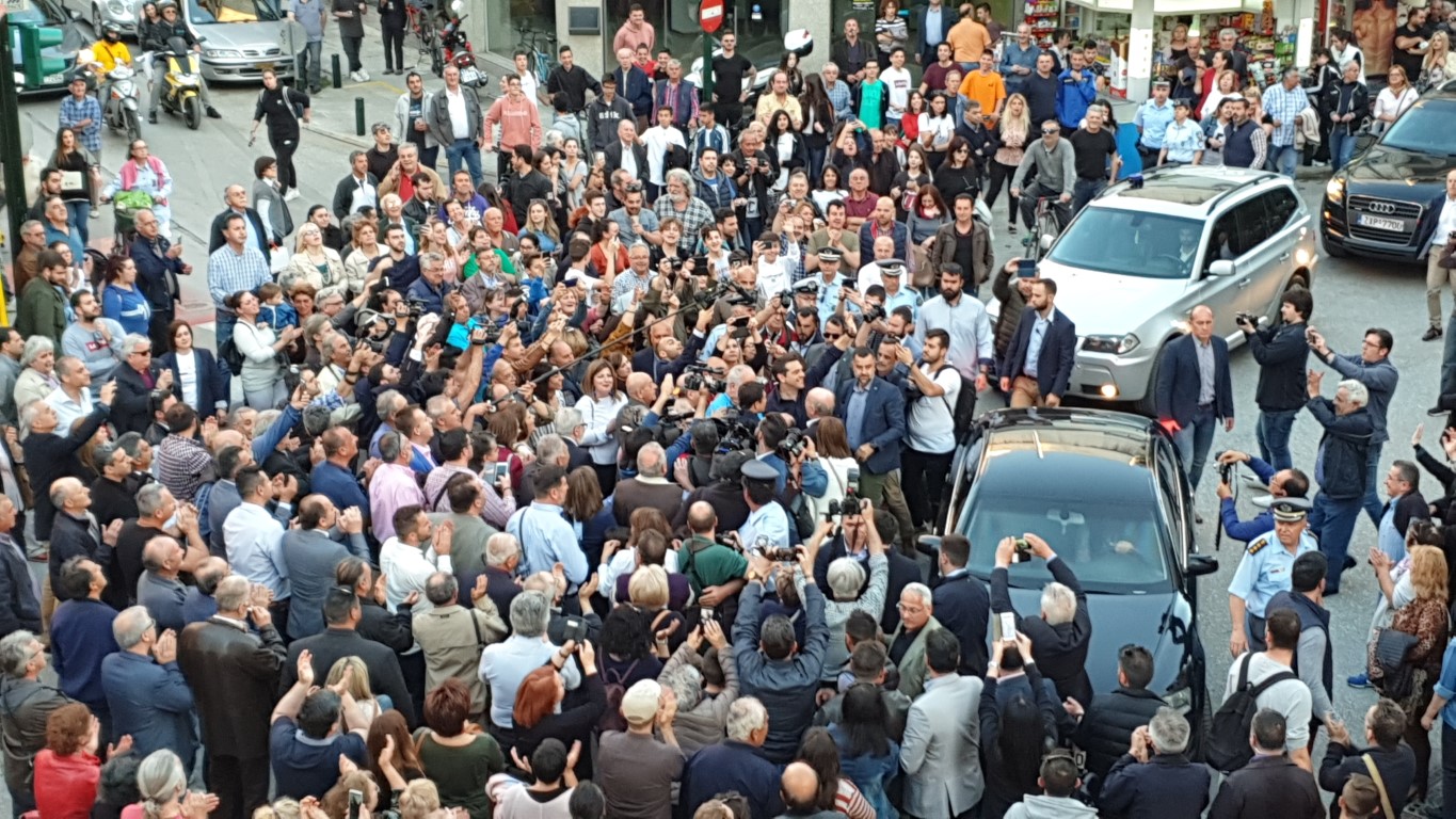 Έγινε δεκτός με επευφημίες και συνθήματα του τύπου «ο λαός δεν ξεχνά τι σημαίνει δεξιά», «είσαι και θα είσαι ο πρωθυπουργός», στην κορυφή του κεντρικού πεζόδρομου της πόλης, αυτόν της Ασκληπιού.