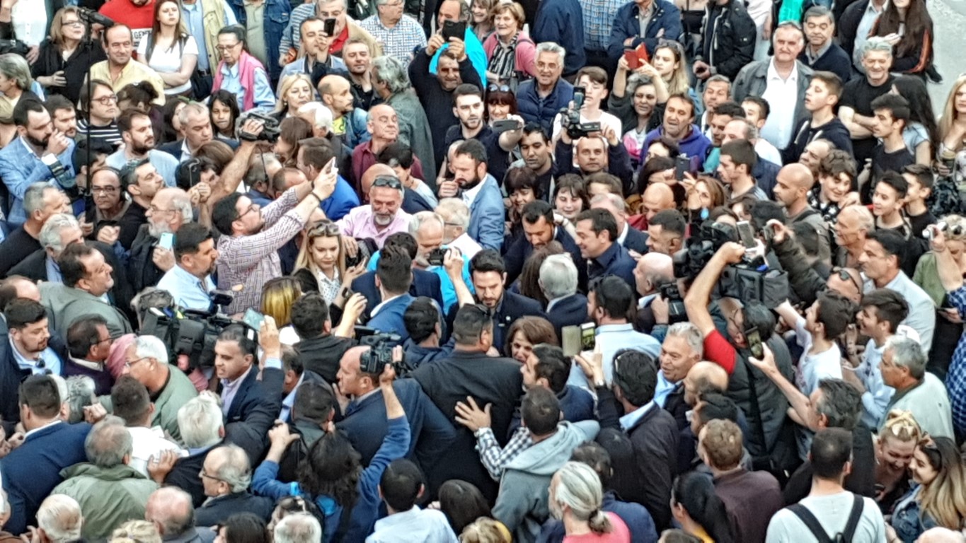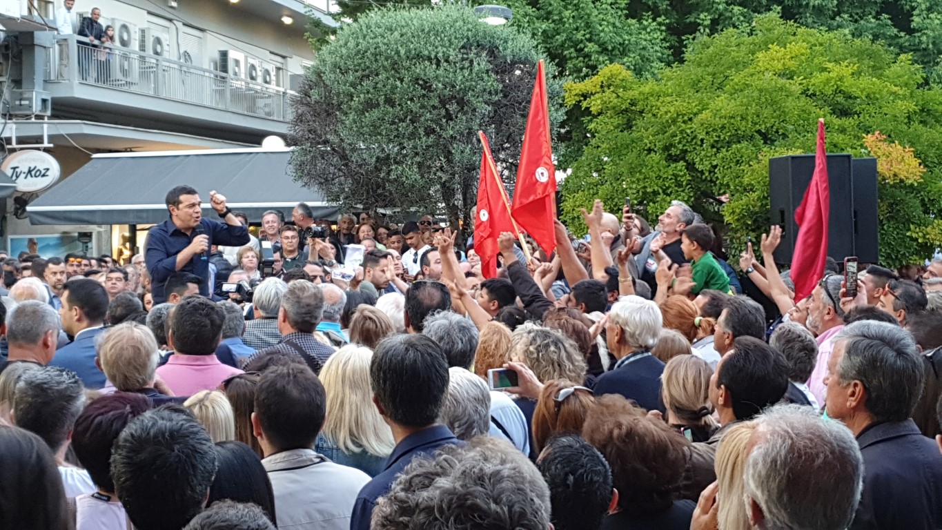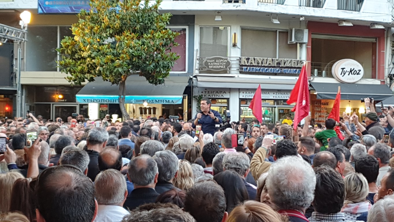 Ο Αλέξης Τσίπρας διέσχισε όλο τον πεζόδρομο χαιρετώντας τον κόσμο φτάνοντας στην άλλη άκρη, απ’ όπου και μίλησε. Κατά την ομιλία του έθεσε τα γνωστά διλλήματα περί προόδου και συντήρησης, επιτέθηκε με σφοδρότητα κατά του Κυριάκου Μητσοτάκη και του μιντιακού συστήματος και δήλωσε βέβαιος για επικράτηση του ΣΥΡΙΖΑ και στις Ευρωεκλογές καθώς «καταρρίπτονται τα αφηγήματα της Ν.Δ.».