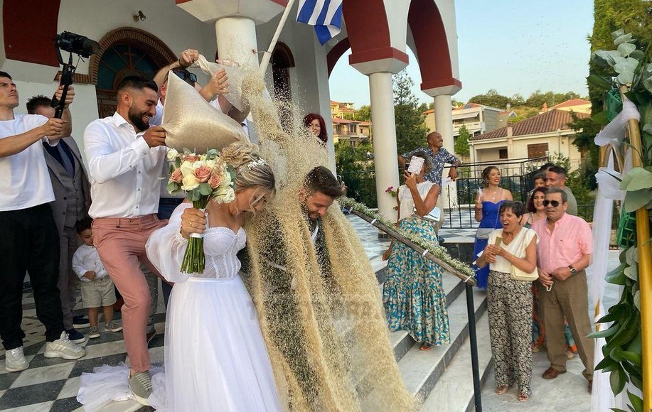 Κατά την έξοδο του ζευγαριού από την εκκλησία φίλοι τους “έλουσαν” κυριολεκτικά με ρύζι. Η γαμήλια δεξίωση δόθηκε στο κέντρο Τσίκαρης στην Καλαμπάκα. Στην αρχή και πριν κόψουν την γαμήλια τούρτα η νύφη έσβησε τα κεράκια τούρτας γενεθλίων αφού την ημέρα εκείνη είχε τα γενέθλιά της. Στη συνέχεια ακολούθησε χορός και το κέφι άναψε με τον Dj να δίνει τον καλύτερο εαυτό του.