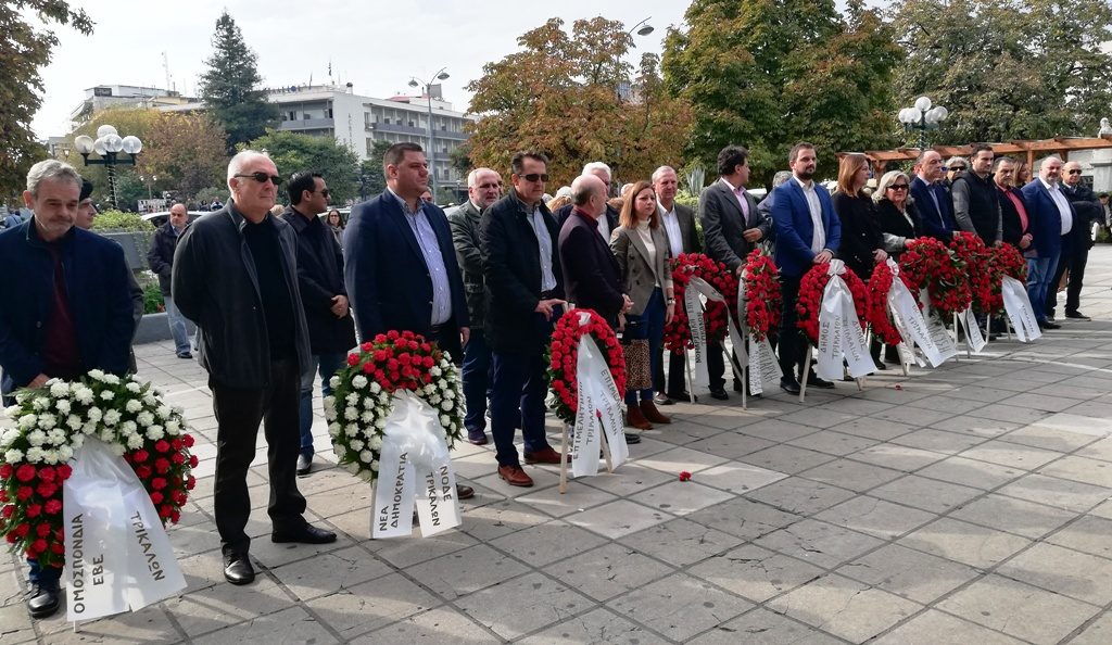 Ακολούθησε κατάθεση στεφάνων από τον Δήμο Τρικκαίων (διά του αντιδημάρχου κ. Α. Αναστασίου), τη βουλευτίνα Τρικάλων κ. Κατ. Παπακώστα, τον βουλευτή κ. Σάκη Παπαδόπουλο εκ μέρους του ΣΥΡΙΖΑ Τρικάλων, την ΠΕ Τρικάλων (διά του αθεματικύ αντιπεριφερειάρχη κ. Ντ. Μπάρδα), τη Διεύθυνση Δευτεροβάθμιας Εκπαίδευσης Τρικάλων (διά της διευθύντριας κ. Β. Κάκλα), τη Διεύθυνση Πρωτοβάθμιας Εκπαίδευσης Τρικάλων (διά του αν. διευθυντή κ. Κωνσταντάκου), το Επιμελητήριο Τρικάλων (διά του οικονομικού επόπτη κ. Στεφ. Γιώτη), την Ομοσπονδία ΕΒΕ Τρικάλων (διά του κ.Μπακογιάννη), τη ΝΜΟΔΕ Τρικάλων της ΝΔ (δφιά του κ. Β. Κρανιά) και το Κίνημα Αλλαγής Τρικάλων (διά του γραμματέα κ. Μανώλη).