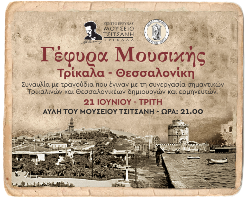 Την πολυεπίπεδη μουσική σύνδεση Τρικάλων – Θεσσαλονίκης αναδεικνύει πρωτότυπη συναυλία που διοργανώνουν ο Δήμος Τρικκαίων και το Μουσείο Τσιτσάνη. Την Τρίτη 21 Ιουνίου 2022, ανήμερα της Ευρωπαϊκής Ημέρας Μουσικής, δίνεται συναυλία στην αυλή του Μουσείου Τσιτσάνη με τίτλο «Γέφυρα Τρίκαλα – Θεσσαλονίκη», στο πλαίσιο των θερινών εκδηλώσεων του Μουσείου «Εβδομάδα Μουσικής και Τέχνης 2022»