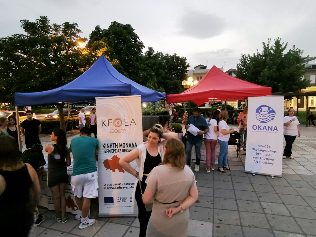 Με μουσική και αλληλεγγύη, το μήνυμα από τα Τρίκαλα για την Παγκόσμια Ημέρα Κατά Των Ναρκωτικών. Η «Μουσική βραδιά στους ρυθμούς του ΣΥΝ και του ΚΑΙ» πραγματοποιήθηκε το βράδυ της Τετάρτης 23 Ιουνίου 2022 στη κεντρική πλατεία Ηρώων Πολυτεχνείου, με την οργάνωση, παρουσία και συνεργασία των κοινωνικών δομών και υπηρεσιών που λειτουργούν στα Τρίκαλα και εποπτεύονται από τον Δήμο Τρικκαίων ή κρατικούς φορείς: ο Συμβουλευτικός Σταθμός ΚΕΘΕΑ Έξοδος Τρικάλων, η Μονάδα Θεραπείας της Εξάρτησης Γ.Ν. Τρικάλων (ΟΚΑΝΑ), το Κέντρο Πρόληψης των Εξαρτήσεων & Προαγωγής της Ψυχοκοινωνικής Υγείας Ν. Τρικάλων – (ΟΚΑΝΑ), το Κέντρο Κοινότητας, η 1η Τοπική Μονάδα Υγείας Τρικάλων, οι Κοινωνικές Δομές Δήμου Τρικκαίων (Κοινωνικό Εστιατόριο, Κέντρο Ημερήσιας Φροντίδας, Κοινωνικό Φαρμακείο), η Κινητή Μονάδα Ψυχικής Υγείας και το Κέντρο Συμβουλευτικής Υποστήριξης Γυναικών Θυμάτων Βίας Δήμου Τρικκαίων έδωσαν το «παρών». Κυρίως, έστειλαν το μήνυμα ευαισθητοποίησης για την πρόληψη και αντιμετώπιση των εξαρτήσεων, μαζί με τους τρικαλινούς και τις τρικαλινές που ανταποκρίθηκαν στο κάλεσμα.