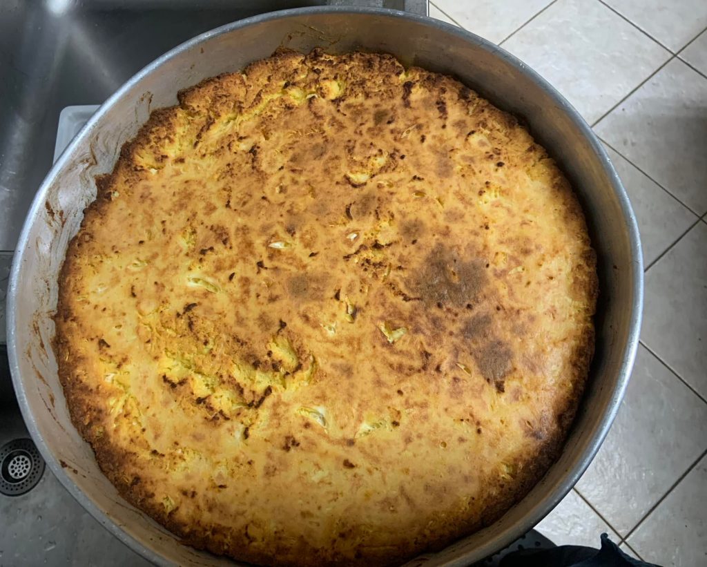 Μπατζίνα, πίτα με κολοκύθι, βουτυρο, τυρί φέτα, αριάνι και καλαμποκάλευρο.
