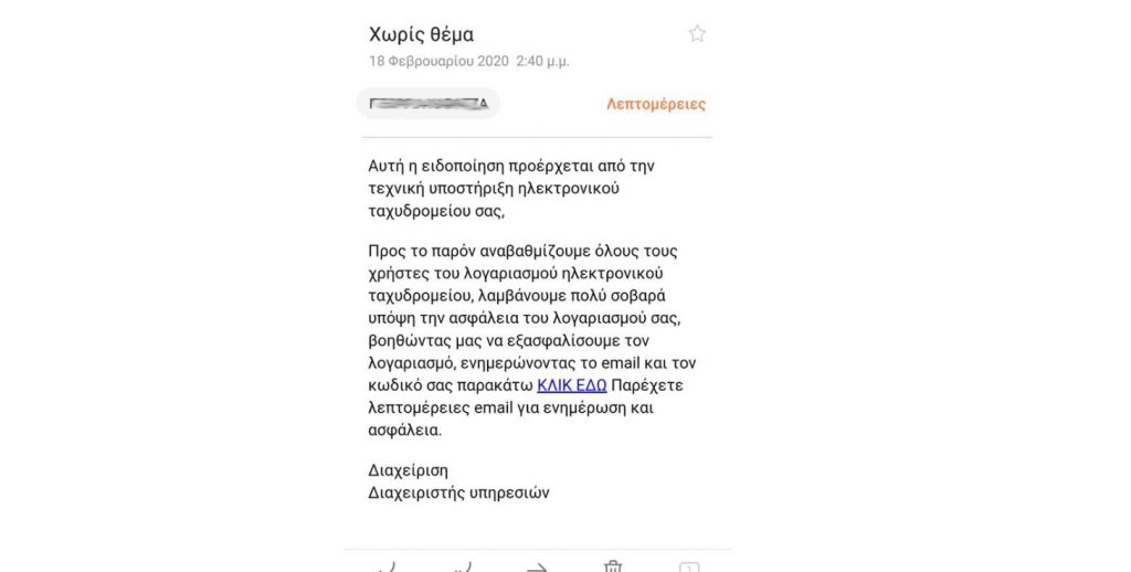 Εξακολουθούν τα e-mail παγίδα προς Τρικαλινούς (… και όχι μόνο). Όπως καταγράφει το trikalavoice.gr τα μηνύματα που αποστέλλονται τις τελευταίες μέρες «καμουφλάρονται» με κανονικά ονόματα ώστε να μην κινούν τις υποψίες. Προτρέπουν όσους τα λαμβάνουν να κάνουν «ΚΛΙΚ» σε συγκεκριμένο σύνδεσμο. Αν κάνουν το λάθος… τέλος!… Υποκλέπτονται οι κωδικοί και ακολουθεί… περιπέτεια…