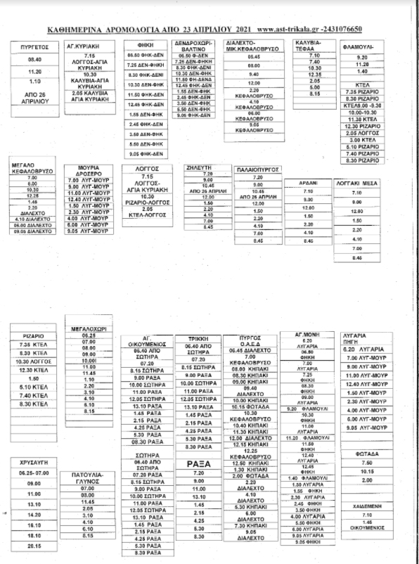 Ενημερώνουμε το επιβατικό κοινό ότι τα δρομολόγια του Αστικού ΚΤΕΛ Τρικάλων, από την Παρασκευή 23 Απριλίου διαμορφώνονται όπως στον παρακάτω πίνακα: