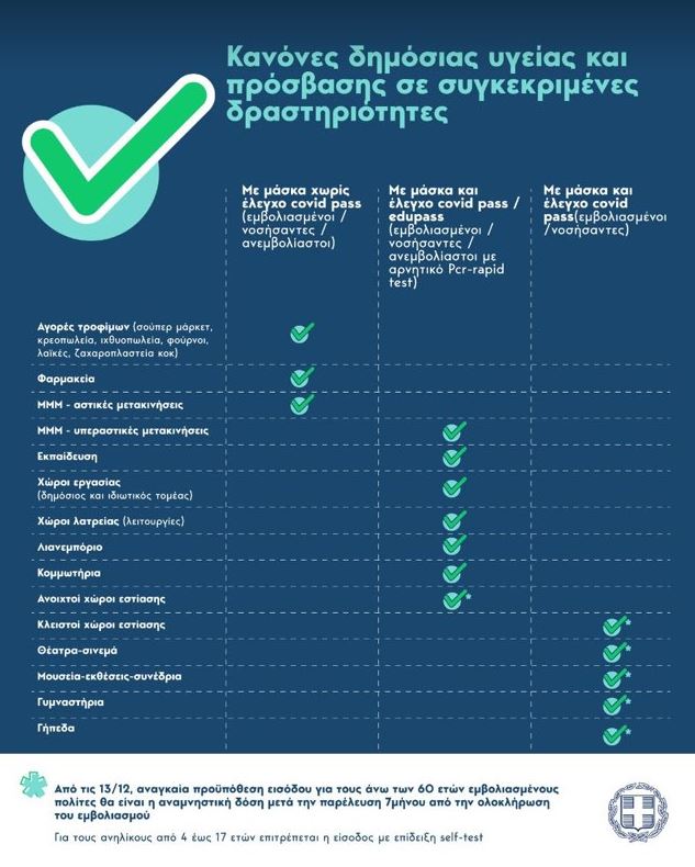 Κατά την είσοδο οι πολίτες υποχρεούνται να επιδεικνύουν, πιστοποιητικό εμβολιασμού ή πιστοποιητικού νόσησης ή βεβαίωσης αρνητικού διαγνωστικού ελέγχου για κοροναϊό (PCR ή rapid test).