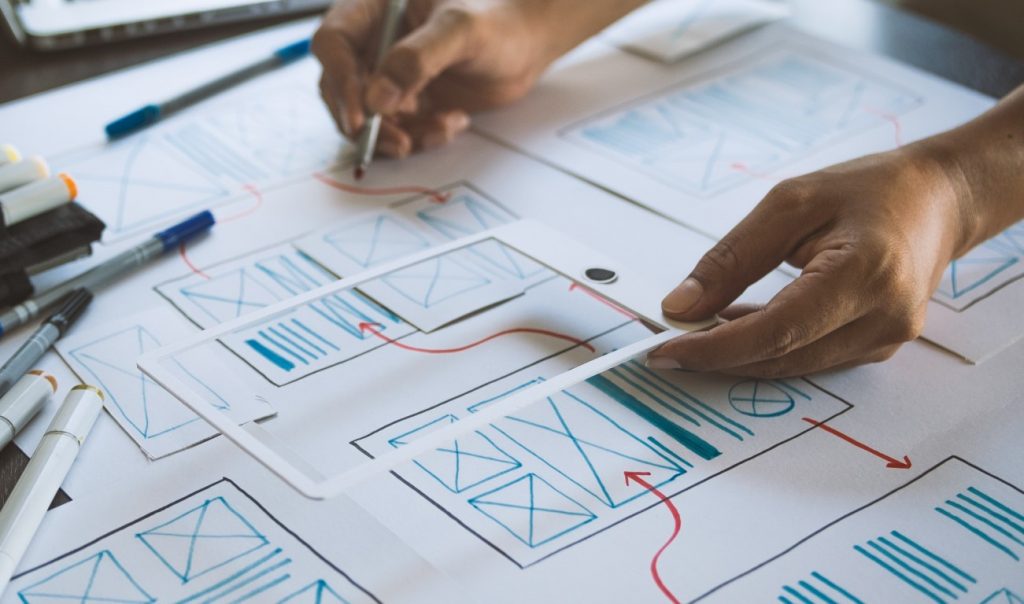 ux Graphic designer creative sketch planning application process development prototype wireframe for web mobile phone . User experience concept.
