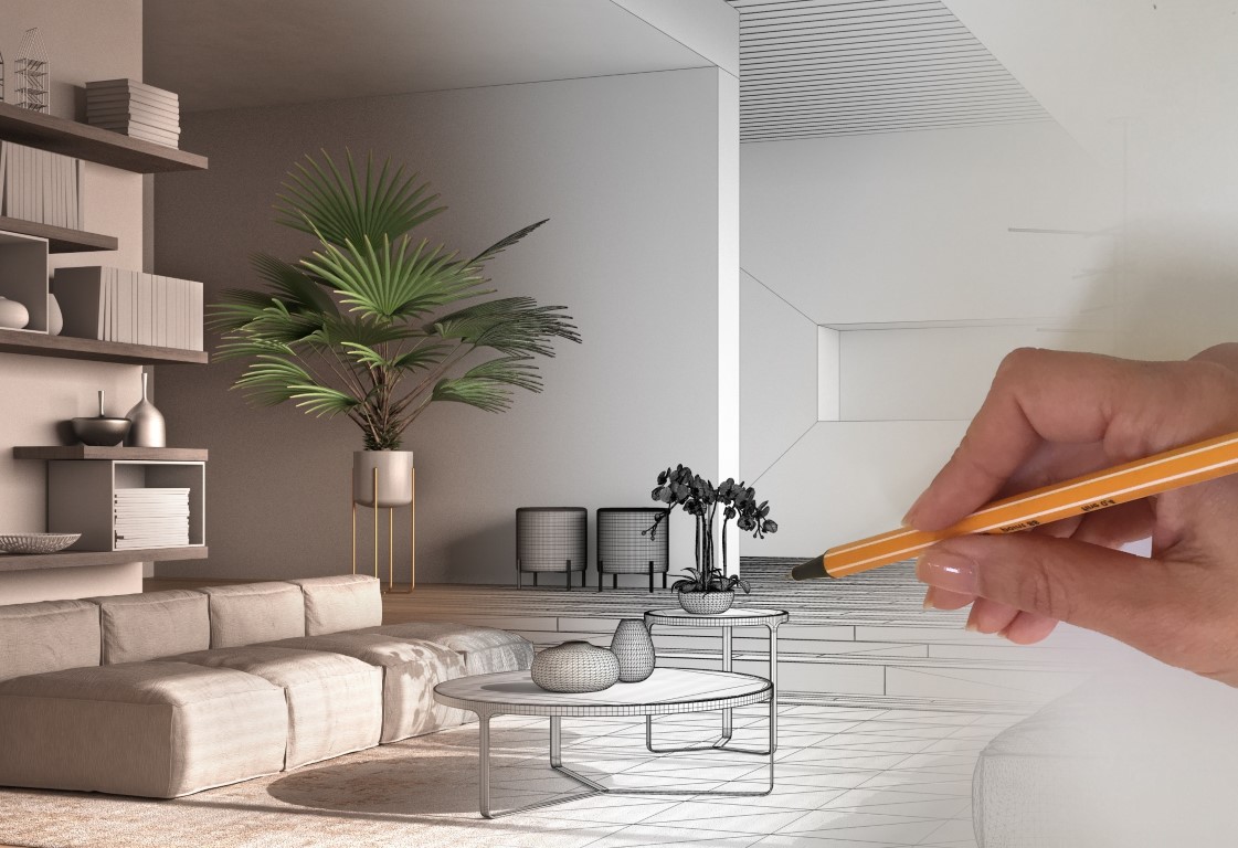 Architect interior designer concept: hand drawing a design interior project while the space becomes real, vintage living room with sofa and tables, carpet, potted plant