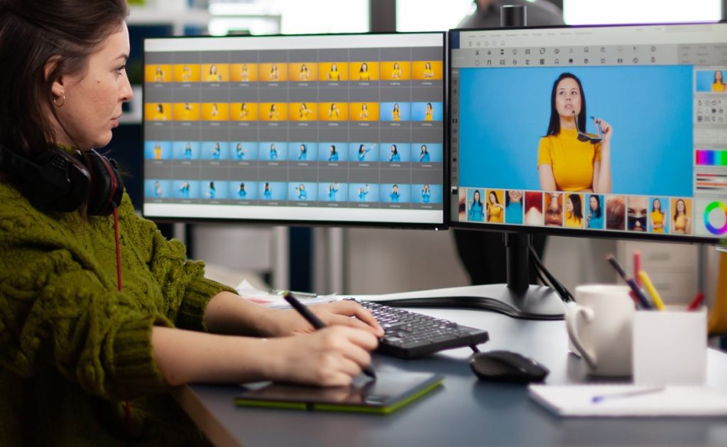 Professional woman photo retoucher working with digital assets in creative multimedia company using with stylus pencil. Content creator doing portrait retouching using post production software