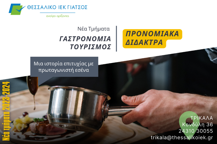 Εξασφάλισε το επαγγελματικό σου μέλλον σπουδάζοντας με προνομιακά δίδακτρα σε μια από τις ειδικότητες του τομέα Γαστρονομίας – Τουρισμού στο ΘΕΣΣΑΛΙΚΟ ΙΕΚ ΓΙΑΤΣΟΣ στα Τρίκαλα, το ΙΕΚ που έφερε αυτές τις σπουδές στην πόλη μας κι ¨έβγαλε¨ εκατοντάδες επαγγελματίες Μάγειρες – Σεφ, Ζαχαροπλάστες – Αρτοποιούς, Στελέχη Τουρισμού – Ξενοδοχείων κλπ.