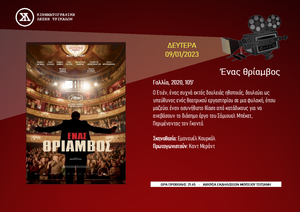 Καλή Χρονιά! Η Κινηματογραφική Λέσχη Τρικάλων υποδέχεται το 2023 τη βραβευμένη το 2020 ως καλύτερη κωμωδία της χρονιάς στα Ευρωπαϊκά Βραβεία, «Ενας θρίαμβος». Η ταινάι θα προβληθεί τη Δευτέρα 9 Ιανουαρίου 2022, στις 21:45, στο Μουσείο Τσιτσάνη.