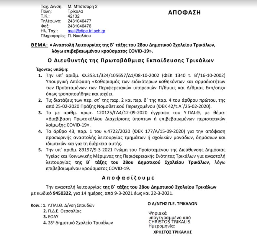 Ακολουθεί η απόφαση της Διεύθυνσης Πρωτοβάθμιας Εκπαίδευσης Τρικάλων: