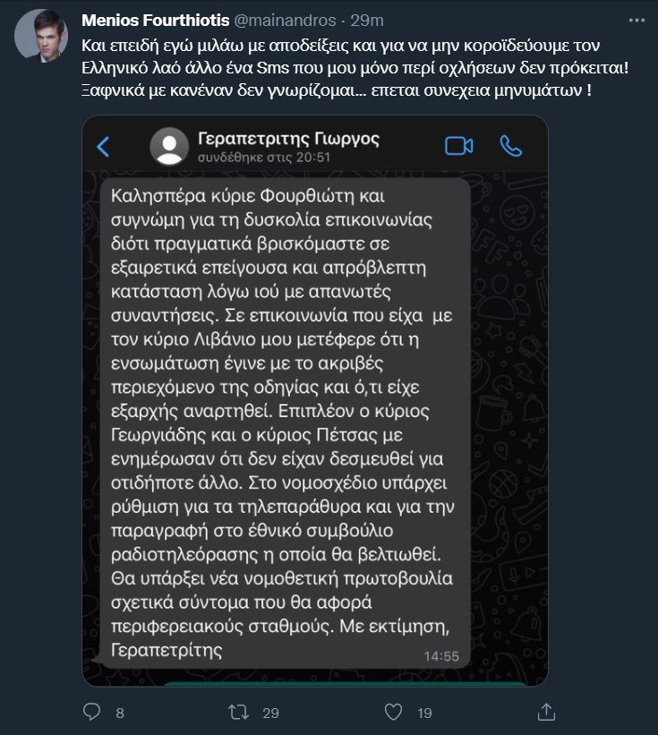 Μετά τις καταγγελίες του πρώην υπουργού κ. Βρούτση για την επίσκεψη του υπόδικου παρουσιαστή Μένιου Φουρθιώτη στο Υπ. Εργασίας απειλώντας ευθέως τον υπουργό, το έργο έχει και συνέχεια.