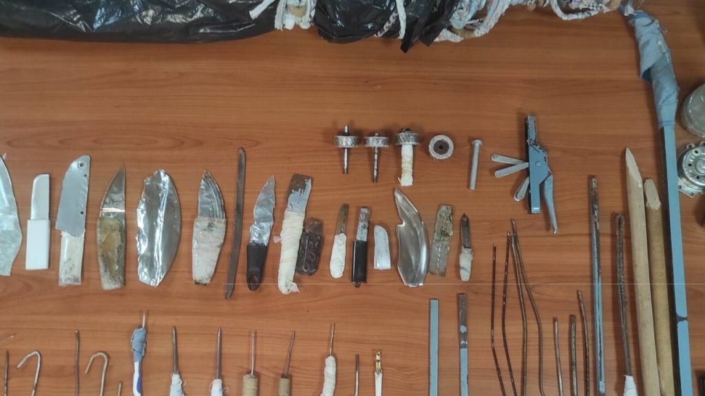 Ειδικότερα, κατά την διάρκεια της έρευνας συνολικά βρέθηκαν και κατασχέθηκαν: 32 γραμμάρια ηρωίνης, αυτοσχέδια μαχαίρια, σουβλιά και λάμες, 3 μεταλλικές και 2 ξύλινες ράβδοι, 3 μεταλλικοί γάντζοι και 4 αυτοσχέδιοι τροχοί ακονίσματος, κινητό τηλέφωνο, κάρτα sim και πλακέτα κινητού τηλεφώνου, 2 λίτρα αυτοσχέδιου αλκοόλ, 10 λίτρα αυτοσχέδιου μείγματος για την παρασκευή αλκοόλ, αυτοσχέδιος αποστακτήρας, 3 αυτοσχέδιοι κλέφτες ρεύματος, καλώδια και βίδες, ηλεκτρικά μάτια και μόνιτορ.