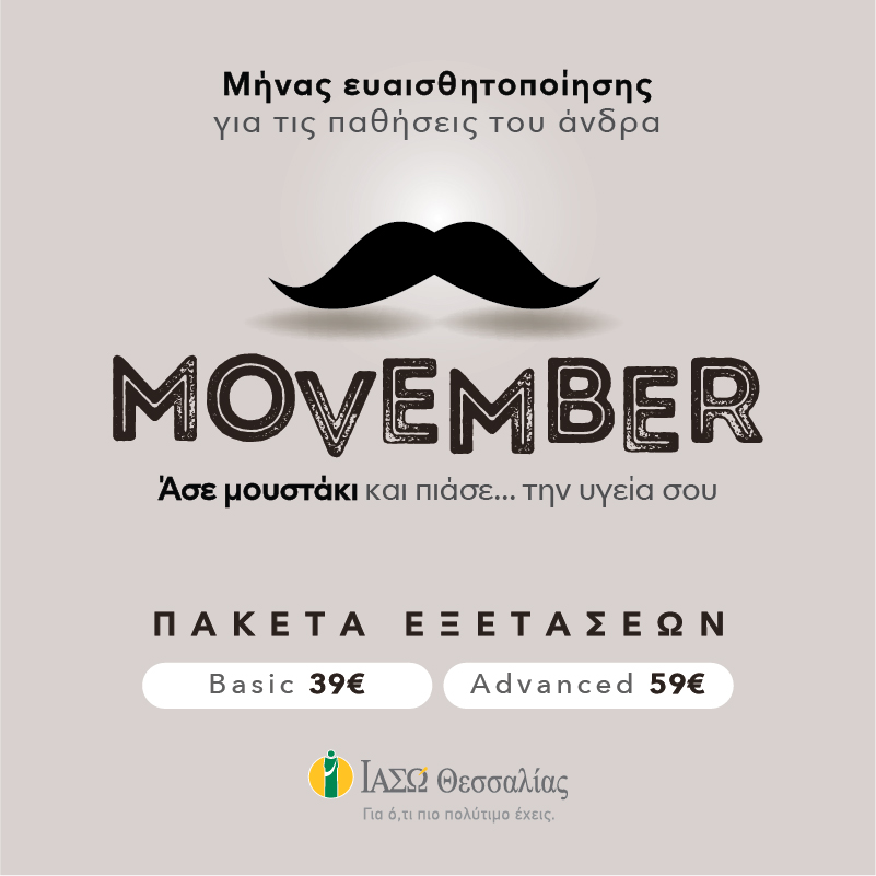 Ο Νοέμβριος, ο μήνας του παγκόσμιου κινήματος Movember*, αποτελεί μήνα ενημέρωσης, ευαισθητοποίησης και πρόληψης ανδρικών παθήσεων και κυρίως των συνηθέστερων καρκίνων των ανδρών (καρκίνος προστάτη, καρκίνος όρχεων, καθώς και ψυχική υγεία) και κάθε χρόνο μας θυμίζει ότι η πρόληψη αφορά και τους άνδρες.
