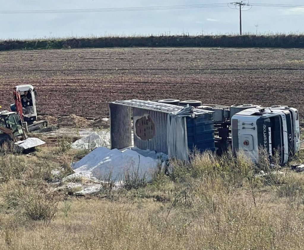 Σε χωματόδρομο λίγο έξω από τη Λάρισα σε παρακείμενο δρόμο της εθνικής οδού Λάρισας – Τρικάλων (μετά το κέντρο Αποκατάστασης Animus) ντελαπάρισε φορτηγό με χωματουργικά υλικά.
