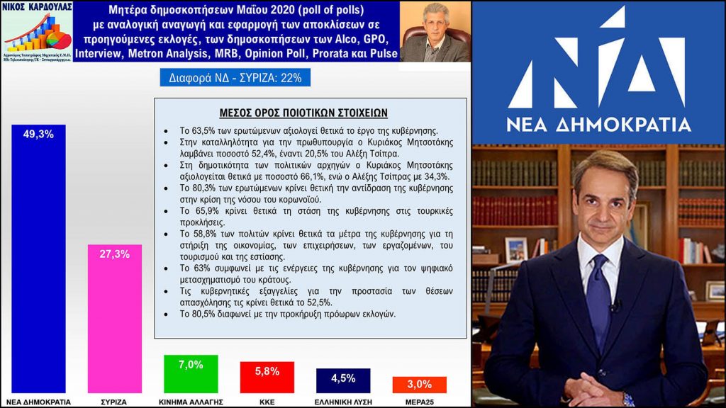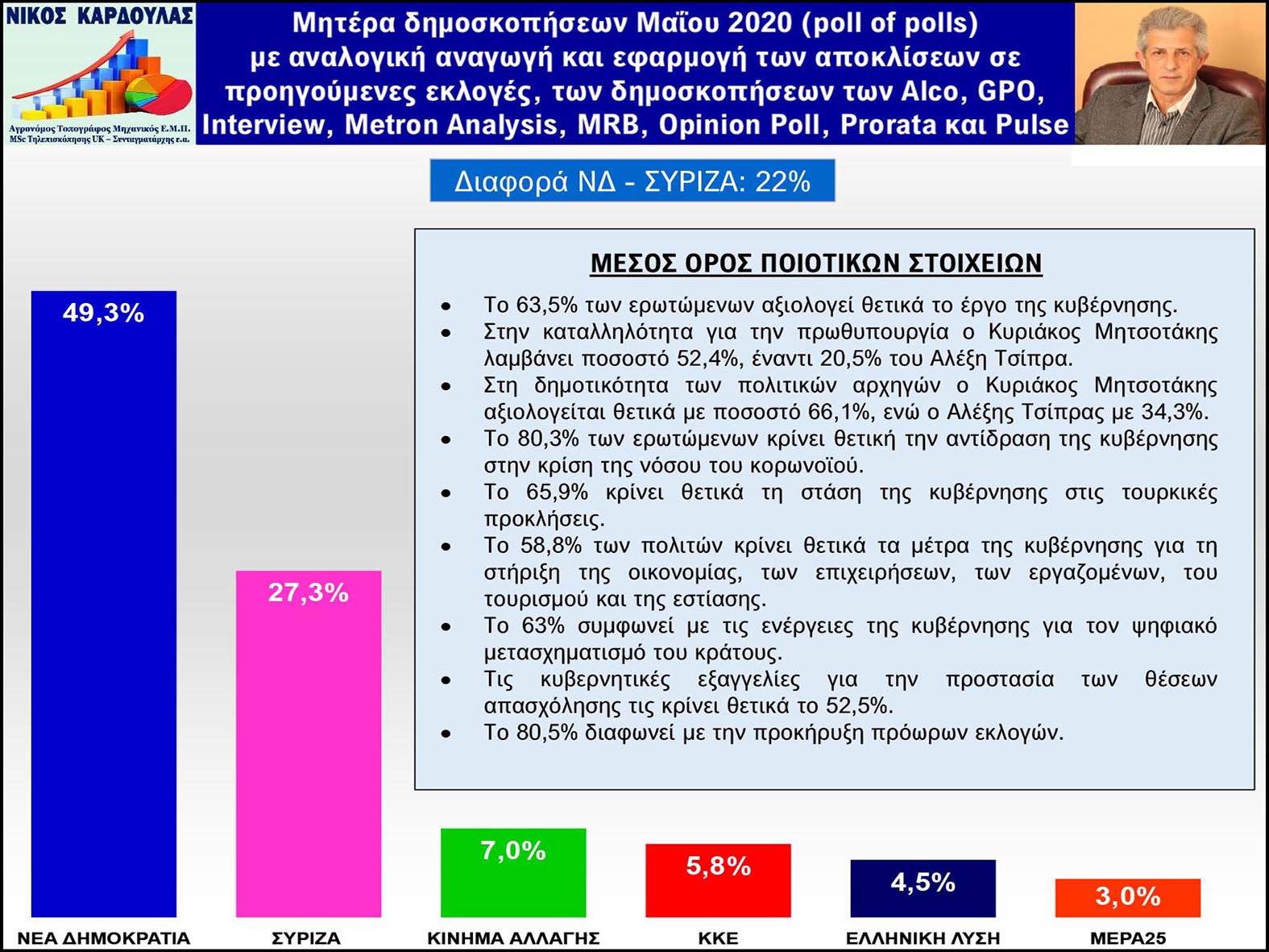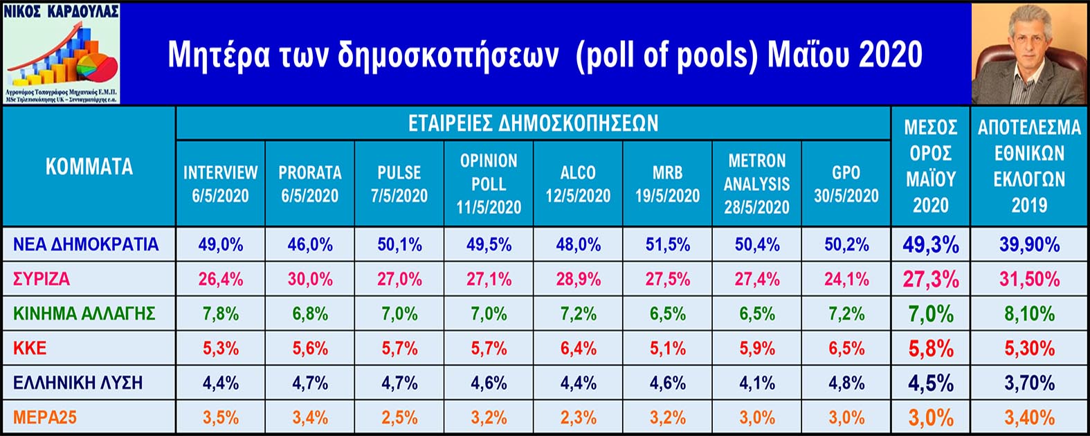 Για την παρούσα ανάλυση ελήφθησαν υπόψη οι έρευνες οκτώ εταιρειών, που δημοσιεύθηκαν τον Μάϊο και συγκεκριμένα των εταιρειών Alco, GPO, Interview, Metron Analysis, Mrb, Opinion Poll, Prorata και Pulse. Για την τελική εκτίμηση, υπολογίσθηκε πρώτα η εκτίμηση ψήφου μετά την αναλογική αναγωγή των λευκών, άκυρων, αποχής και αναποφάσιστων, στη συνέχεια εφαρμόσθηκαν οι αποκλίσεις που είχαν οι συγκεκριμένες εταιρείες στις εθνικές εκλογές 2019, πλην της GPO που δεν είχε διεξάγει τότε έρευνα και στη συνέχεια υπολογίσθηκε ο μέσος όρος τους, όπως φαίνεται στον παρακάτω πίνακα, όπου απεικονίζονται και τα ποσοστά των κομμάτων στις εθνικές εκλογές 2019.