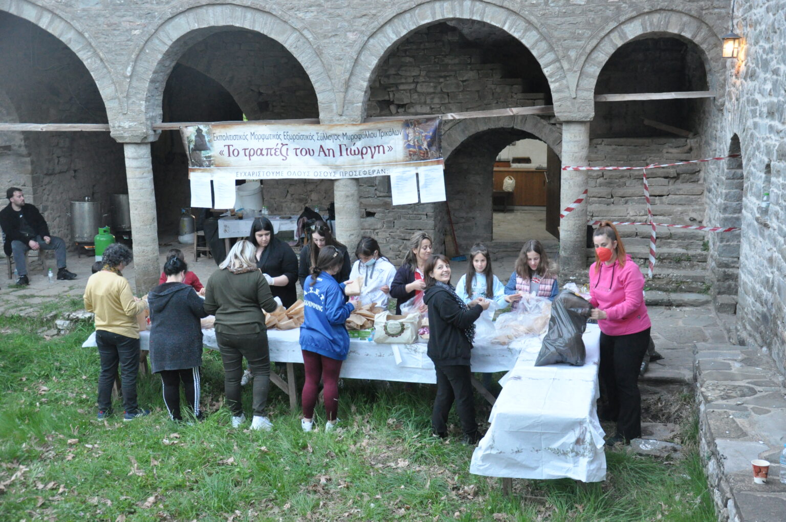 Ο Εκπολιτιστικός Μορφωτικός Εξωραϊστικός Σύλλογος Μυροφύλλου Τρικάλων είχε καθιερώσει τα τελευταία χρόνια το «Τραπέζι το Αη Γιώργη», την παραδοσιακή «φιλοξενία» των προσκυνητών με «καζάνι» με πρόβιο κρέας από δωρεές των πιστών. Μετά από δύο χρόνια απουσίας λόγω της πανδημίας φέτος τα μέλη του συλλόγου από βραδύς συγκεντρώθηκαν στο μοναστήρι και ευλαβικά ετοίμασαν τα σφάγια. Την επομένη το «καζάνι» ευλογήθηκε από τον ιερέα και διανεμήθηκε στους πανηγυριστές με την ευλογία του Αγίου. Το διοικητικό συμβούλιο ευχαριστεί τους Ουρανία Μπαρκονίκου, Αθανάσιο Φαλαγκάρα, Αθανάσιο Μανταλιά, Δήμητρα και Αγγελική Μανταλιά, Μπάμπη Ζάχο, Κωνσταντίνο Μανταλιά, Παναγιώτη Δουβλαντώνη, Βάγια Φαλαγκάρα, Νικόλαο Ράπτη, Αριστοτέλη Ζιώγα, Ελευθέριο Καρακίτσο, Δημήτρη Σουλιώτη, Δημήτρη Μπαρμπάνη, Ευάγγελο Τσιρογιάννη για τις προσφορές τους, καθώς επίσης και όλους τους εθελοντές που εργάστηκαν για την προετοιμασία και τη διανομή.