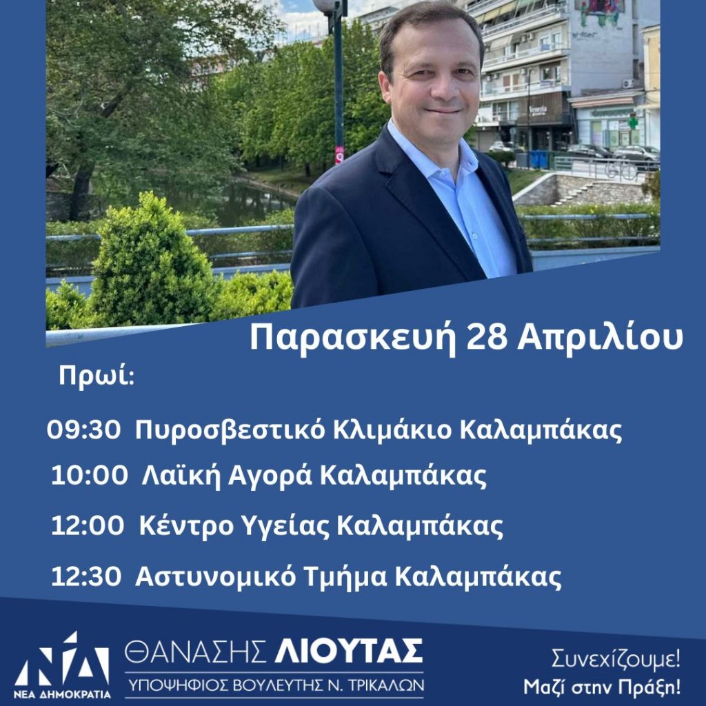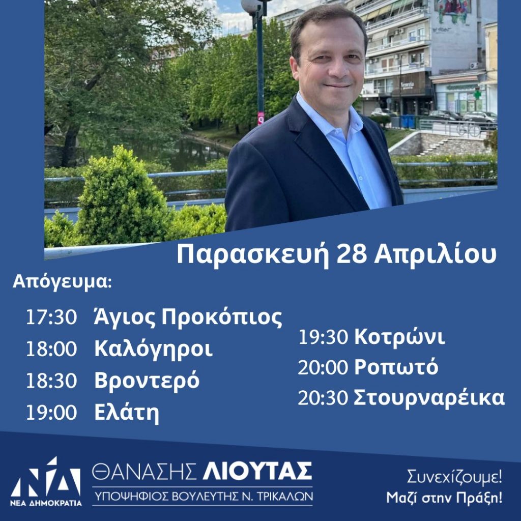Τετάρτη 26 Απριλίου, σταθμοί της περιοδείας του Θανάση Λιούτα: το Ελληνόκαστρο, ο Πλάτανος, η Σωτήρα, η Λεπτοκαρυά, η Θεόπετρα, οι Σπαθάδες, το Ρίζωμα και η Ράξα. Συνομίλησε με τους κατοίκους και συζήτησαν. Συζήτησαν για όσα πέτυχε η πολιτική του Κυριάκου Μητσοτάκη αυτά τα τέσσερα χρόνια. Συζήτησαν για το νέο πρόγραμμα της Νέας Δημοκρατίας. Για τους νέους στόχους που τίθενται για τη νέα τετραετία πάντα με στόχο, τη συνέχιση της ανάπτυξης,