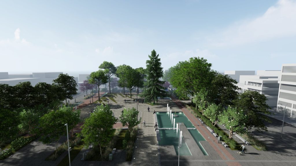 Αναφορικά με την Κεντρική πλατεία (Ηρώων Πολυτεχνείου), προβλέπονται οι απαραίτητες εργασίες διαμόρφωσης εδάφους (εκσκαφές, επιχώσεις, καθαιρέσεις) για τη δημιουργία ενός εκτεταμένου, ανοιχτού κεντρικού πλατώματος .