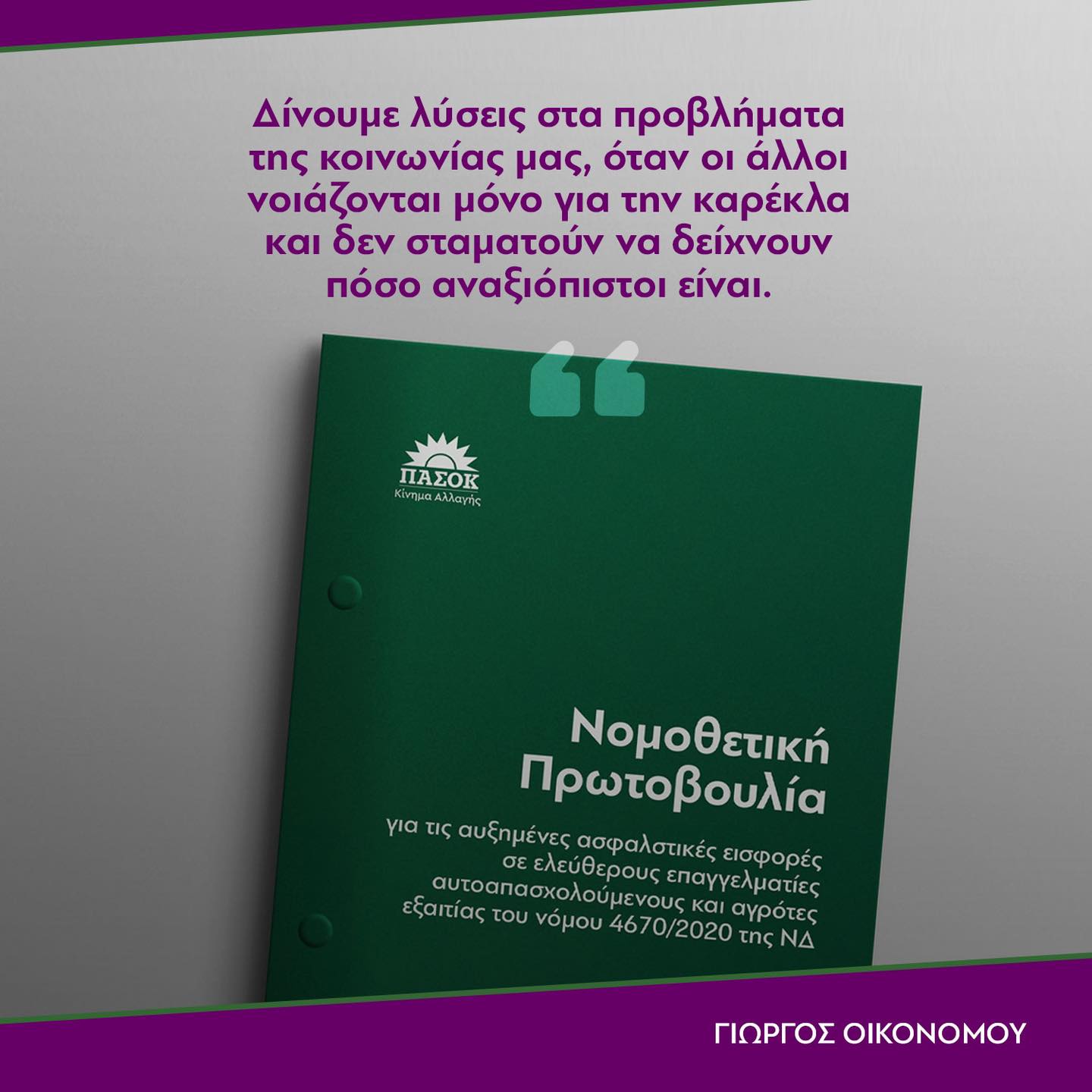 Νέα νομοθετική πρωτοβουλία του ΠΑΣΟΚ για να μην επιβαρυνθούν με μεγαλύτερες ασφαλιστικές εισφορές οι εκατοντάδες χιλιάδες ελεύθεροι επαγγελματίες και αυτοαπασχολούμενοι καθώς και οι αγρότες εξαιτίας του νόμου 4670/2020 της ΝΔ.