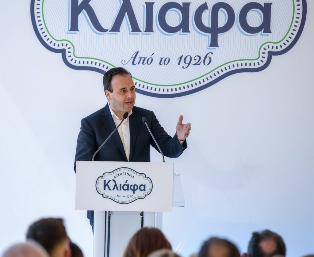 Ο κ. Παπαστεργίου, αφού ευχαρίστησε τους αδελφούς Τάκη και Μιχάλη Σαράντη για την προσφορά τους, επισημαίνοντας ότι η πορεία τους αποτελεί παράδειγμα έμπνευσης για «πολλούς νέους επιχειρηματίες σε όλη τη χώρα», ευχήθηκε «Καλή αρχή στη νέα εποχή της εταιρείας Οικογένεια Κλιάφα».