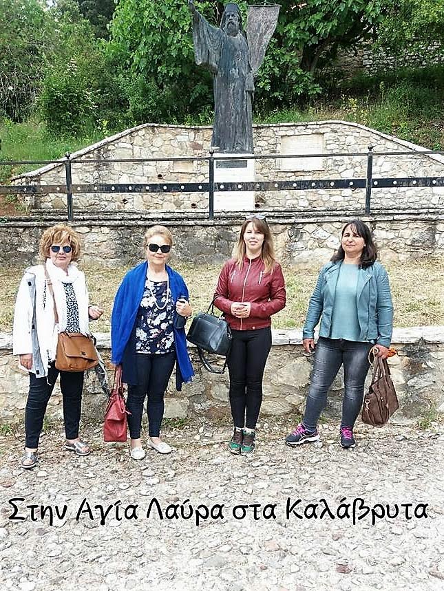 Επόμενος προορισμός μας, μια από τις πιο εντυπωσιακές περιοχές της Αχαΐας, που καλύπτεται από τον ορεινό όγκο του Χελμού, η όμορφη και γραφική κωμόπολη των Καλαβρύτων, που αποτελεί πόλο έλξης πολλών επισκεπτών. Η διαδρομή έγινε με τον οδοντωτό σιδηρόδρομο Διακοφτού. Είναι το τρένο που έχει τη δυνατότητα να σκαρφαλώνει ψηλά, στις μεγάλες κλίσεις του εδάφους, μέσα από περιοχές με μοναδικό ενδιαφέρον περιήγησης. Το τρενάκι περνούσε από μικρά τούνελ, όπου ανάμεσα στα μικρά ανοίγματα, διακρίναμε βραχώδες σπηλιές. Η διαδρομή μαγευτική, μέσα σε άγρια τοπία και καταρράκτες. Τα μάτια μας βυθίζονται στην ομορφιά της φύσης. Οι σκιές που κατεβαίνουν από τα πανύψηλα πλατάνια, αγκαλιάζουν τους ορμητικού καταρράκτες, σαν να σε καλούσαν να τους εξερευνήσεις. Φτάνουμε στα Καλάβρυτα. Γυρίσαμε ολόγυρα το βλέμμα μας. Στο σμίξιμο των πλαγιών, στο μικρό οροπέδιο, χτισμένα σπίτια παραδοσιακά. Η φύση προικισμένη απλόχερα με φυσικό πλούτο και ασύγκριτη ομορφιά. Τα βήματά μας, μας οδήγησαν ευλαβικά στην Ιερά Μονή της Αγίας Λαύρας, όπου το 1821 αποτέλεσε το κέντρο της εθνεγερσίας κατά των Τούρκων, με την ύψωση του Λαβάρου και την ορκωμοσία των αγωνιστών, από τον Παλαιών Πατρών Γερμανό. Βυθισμένο το μοναστήρι μέσα στη γαλήνη του. Η μνήμη μας κινήθηκε στα περασμένα. Ένα ανάλαφρο ψυχρό αεράκι χάιδευε τα πρόσωπά μας. Κατά την επίσκεψή μας στο Μουσείο, θαυμάσαμε με συγκίνηση το Λάβαρο της ορκωμοσίας των αγωνιστών του 1821. Ο Επιτάφιος του 1754, κεντημένος στη Σμύρνη, η εικόνα του Αγ. Γεωργίου κεντημένη στην Κων/πολη, χρυσοκέντητα άμφια του Παλαιών Πατρών Γερμανού κ.α.