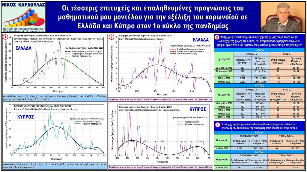 4η: Επιτυχής πρόβλεψη του συνολικού αριθμού κρουσμάτων και θυμάτων στο τέλος του 1ου κύκλου της πανδημίας, τόσο στην Ελλάδα, όσο και στην Κύπρο. Στην Ελλάδα μέχρι τις 4 Μαΐου είχαν προβλεφθεί 2429-2685 κρούσματα και 136-150 θύματα και τα επίσημα επιβεβαιωμένα στοιχεία από τον ΕΟΔΥ στις 4 Μαΐου ήταν 2632 κρούσματα και 146 θύματα αντίστοιχα. Το ίδιο συνέβη και στην Κύπρο, όπου είχαν προβλεφθεί μέχρι τις 6 Μαΐου 829-916 κρούσματα και 20-24 θύματα και τα επίσημα επιβεβαιωμένα στοιχεία από το Υπουργείο Υγείας στις 6 Μαΐου ήταν 883 κρούσματα και 21 θύματα αντίστοιχα.