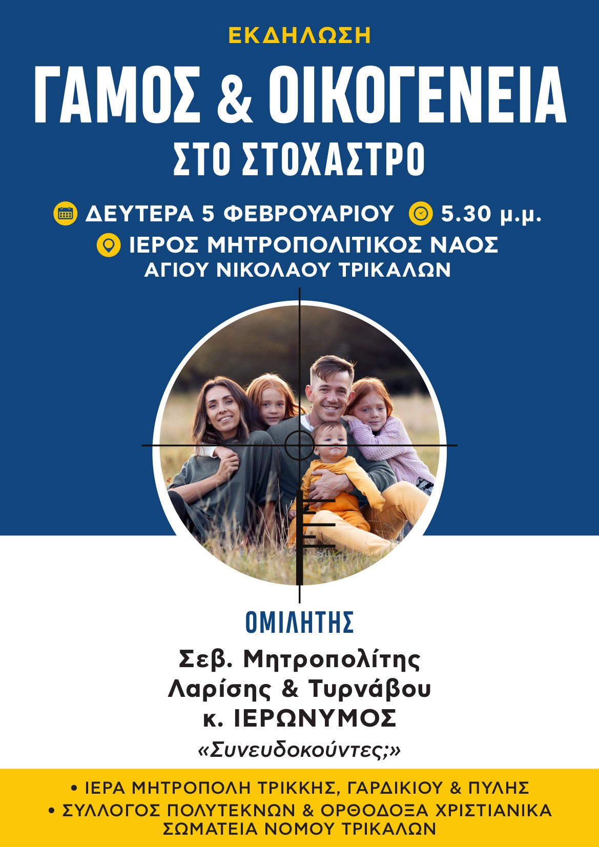 Η Ιερά Μητρόπολη Τρίκκης, Γαρδικίου και Πύλης, σε συνεργασία με τον Σύλλογο Πολυτέκνων και τα Ορθόδοξα Χριστιανικά Σωματεία του Νομού Τρικάλων, οργανώνει τη Δευτέρα, 5 Φεβρουαρίου 2024, και ώρα 17:30 εκδήλωση στον Ιερό Μητροπολιτικό Ναό Αγίου Νικολάου Τρικάλων με σκοπό να προβάλει τις θέσεις της Εκκλησίας της Ελλάδος ως προς τις προεκτάσεις του επίμαχου Σχεδίου Νόμου «Ισότητα στον πολιτικό γάμο, τροποποίηση του Αστικού Κώδικα και άλλες διατάξεις» του Υπουργού Επικρατείας.