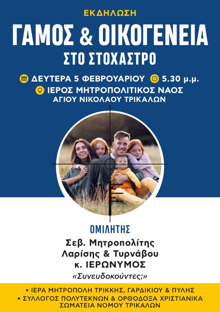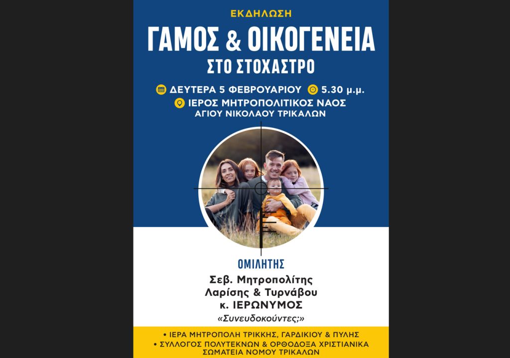 Η Ιερά Μητρόπολη Τρίκκης, Γαρδικίου και Πύλης, σε συνεργασία με τον Σύλλογο Πολυτέκνων και τα Ορθόδοξα Χριστιανικά Σωματεία του Νομού Τρικάλων, οργανώνει τη Δευτέρα, 5 Φεβρουαρίου 2024, και ώρα 17:30 εκδήλωση στον Ιερό Μητροπολιτικό Ναό Αγίου Νικολάου Τρικάλων με σκοπό να προβάλει τις θέσεις της Εκκλησίας της Ελλάδος ως προς τις προεκτάσεις του επίμαχου Σχεδίου Νόμου «Ισότητα στον πολιτικό γάμο, τροποποίηση του Αστικού Κώδικα και άλλες διατάξεις» του Υπουργού Επικρατείας.