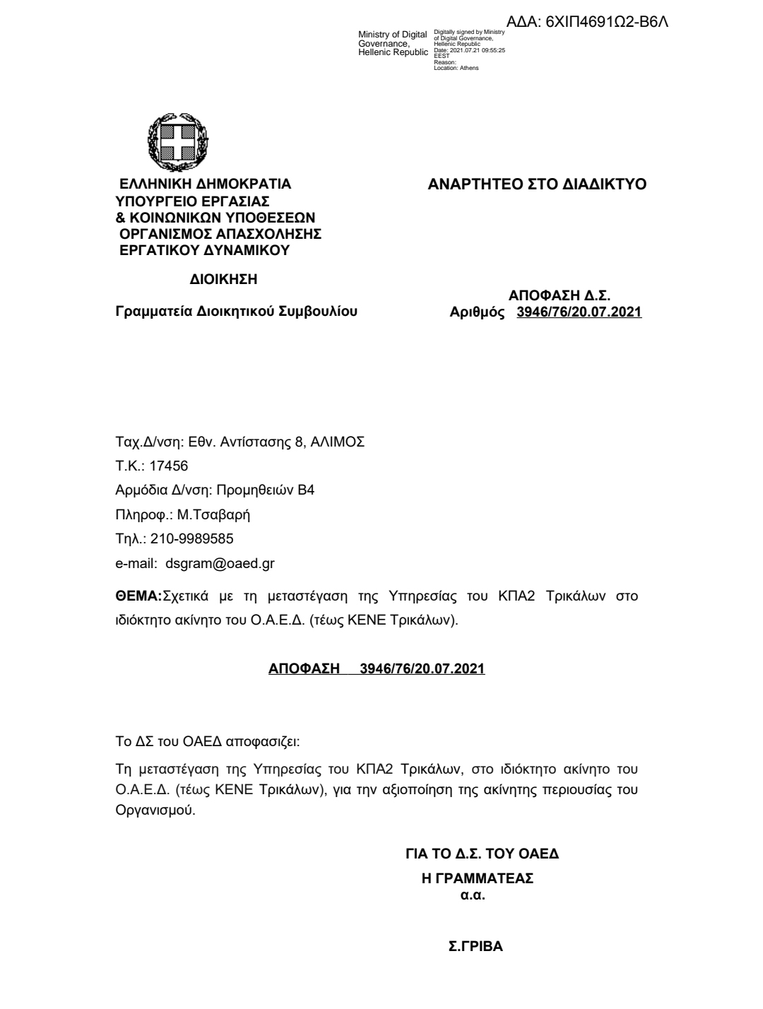 Σε νέο ιδιόκτητο κτίριο μετεγκαθίσταται το παράρτημα Τρικάλων του Οργανισμού Απασχόλησης Εργατικού Δυναμικού.