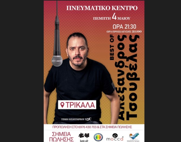 Ο Αλέξανδρος Τσουβέλας, ο κωμικός, μίμος και ραδιοφωνικός παραγωγός, θα βρίσκεται στα Τρίκαλα για μία παράσταση, την Πέμπτη 4 Μαΐου 2023.