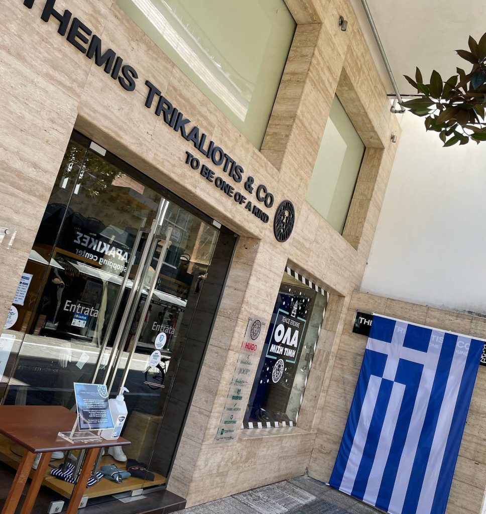 Με μια τεράστια σημαία έξω από το κατάστημά του επί της Ιουλιέτας Αδάμ ο Θέμης Τρικαλιώτης τιμά τα 201 χρόνια από την επανάσταση του 1821.