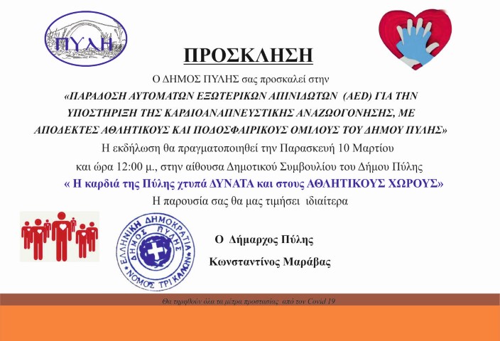 Ο Δήμαρχος Πύλης Κώστας Μαράβας, παραδίδει την Παρασκευή 10 Μαρτίου στην αίθουσα του δημοτικού συμβουλίου στο δημαρχείου Πύλης, τους αυτόματους εξωτερικούς απινιδωτές (ΑΕD) για την υποστήριξη της καρδιοαναπνευστικής αναζωογόνησης.