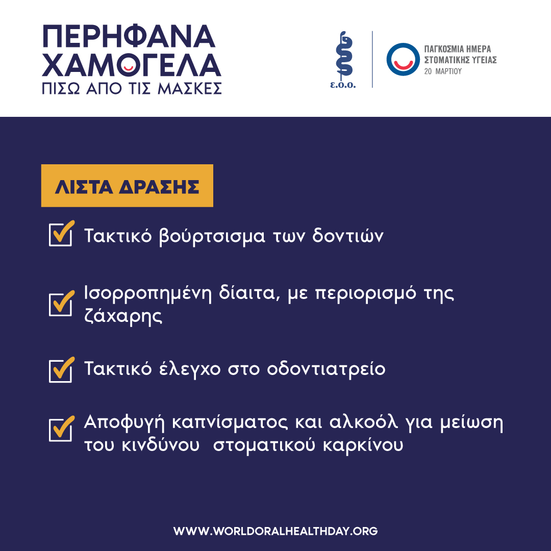 Ειδικά για φέτος, με τις ιδιαίτερες συνθήκες που έχει δημιουργήσει η πανδημική κατάσταση στην ζωή όλων μας η Ελληνική Οδοντιατρική Ομοσπονδία έχει επιλέξει ως κεντρικό σύνθημα για τον εορτασμό της Παγκόσμιας Ημέρας Στοματικής το
