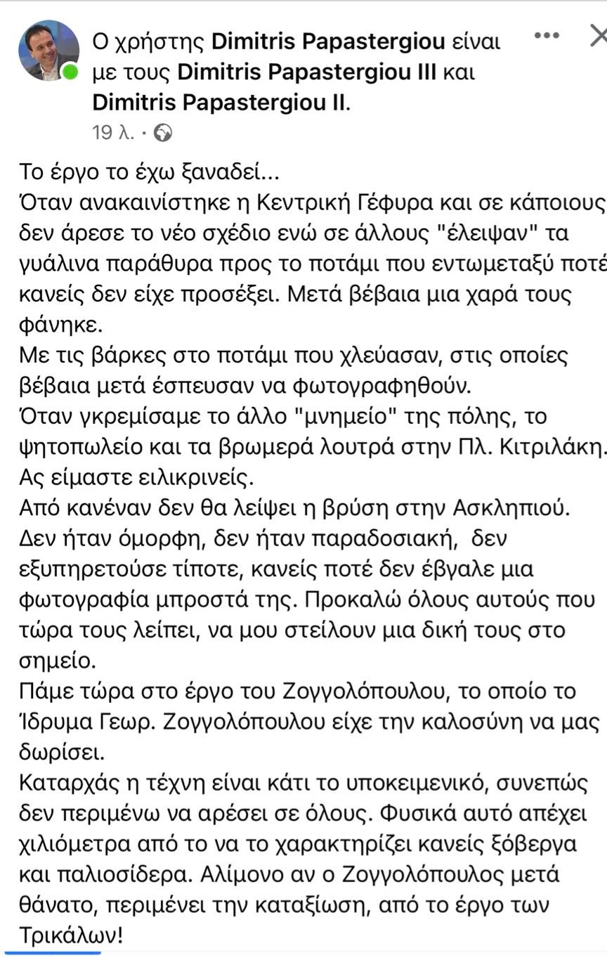 Με μια μακροσκελή ανάρτησή του ο δήμαρχος Τρικκαίων Δημήτρης Παπαστεργίου απαντάει στους επικριτές του αναφορικά με το εικαστικό αποτέλεσμα και την τοποθέτηση του έργου “ομπρέλα” στον πεζόδρομο της Ασκληπιού.