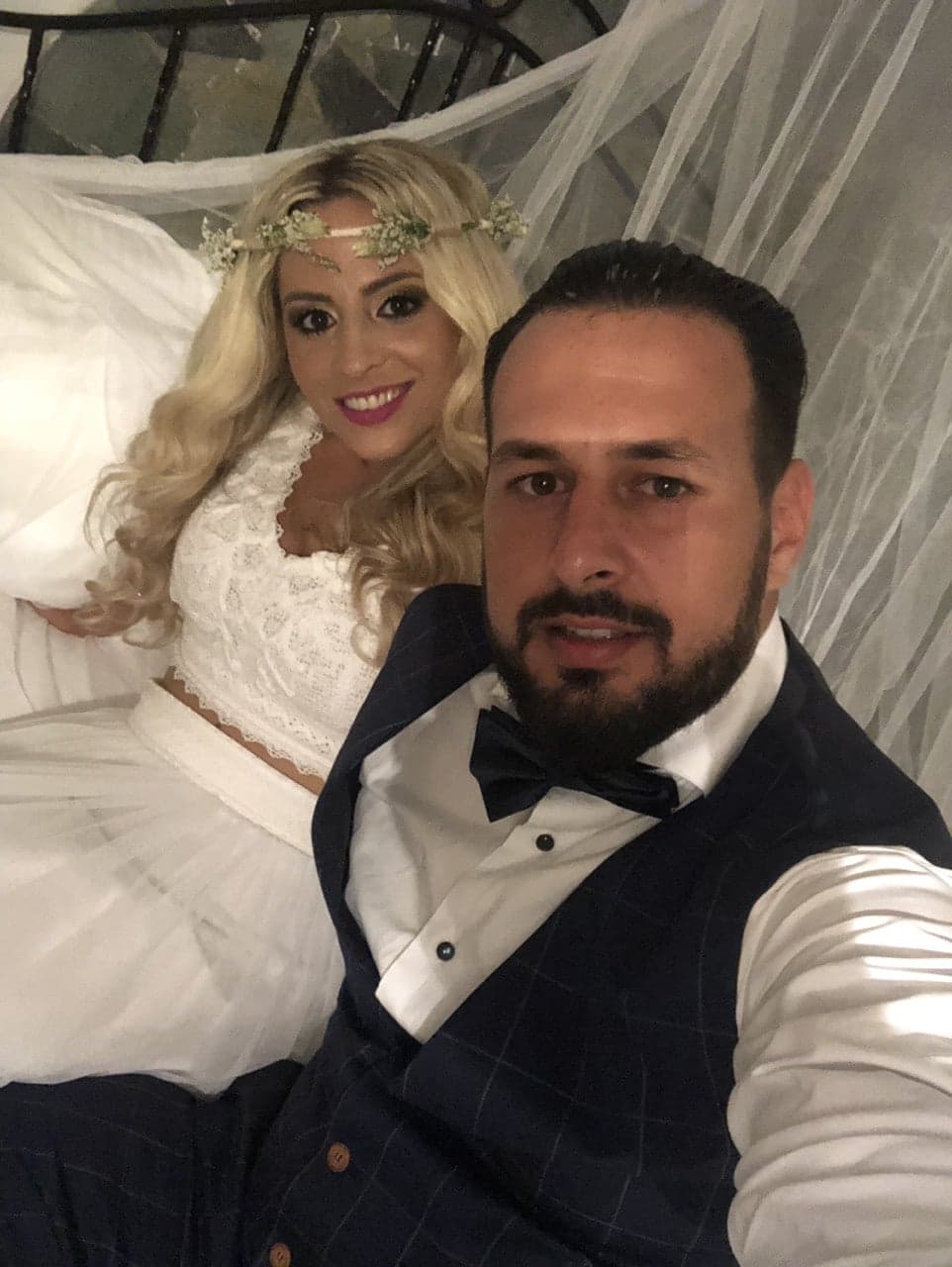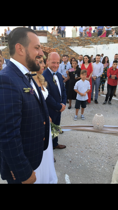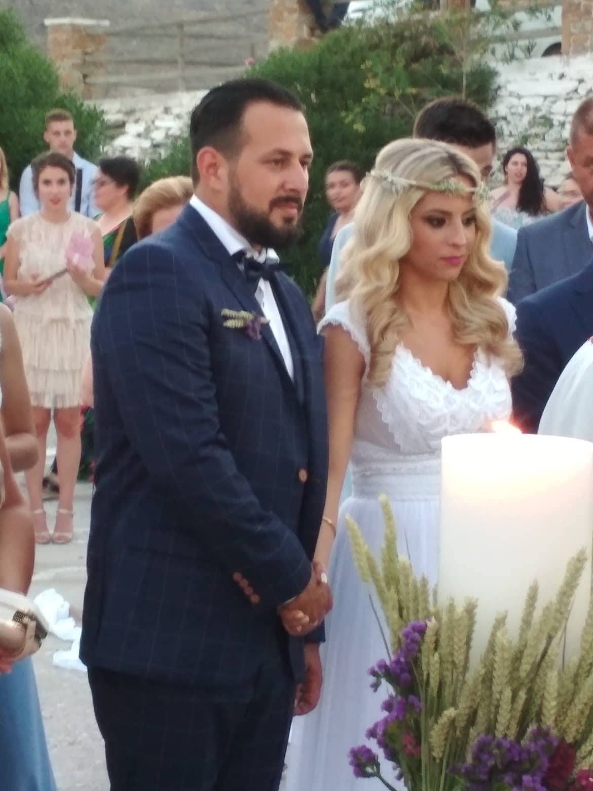 Ο Βασίλης Αντωνίου (αυτοκινητιστής) και η αγαπημένη του Φωτεινή (ιδιωτική υπάλληλος) έφτασαν στο νησί μαζί με τους δεκάδες καλεσμένους τους. Ένα πλοίο δικό τους!!!… Κι ύστερα ανέβηκαν μαζί τα σκαλοπάτια της εκκλησιάς και ενώπιον Θεού κι ανθρώπων αντάλλαξαν όρκους αιώνιας πίστης και αφοσίωσης, με κουμπάρο τον Νίκο Νάκα (Lary) και τους γονείς τους, Κατερίνα Ζουμπίλη, Αθανάσιο και Γιώτα Παλαιού, εμφανώς συγκινημένους.