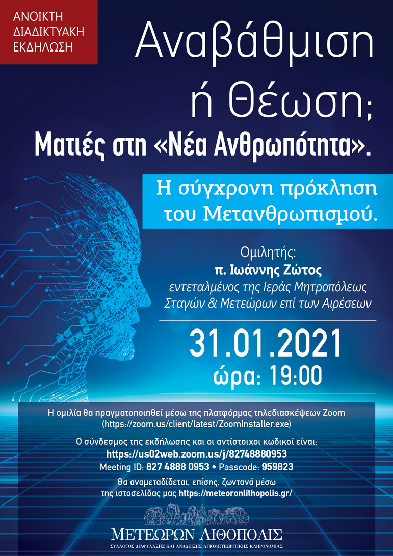 Ομιλητής θα είναι ο π. Ιωάννης Ζώτος, εντεταλμένος της Ιεράς Μητροπόλεως Σταγών & Μετεώρων επί των Αιρέσεων, με θέμα: «Αναβάθμιση ή Θέωση; Ματιές στη “Νέα Ανθρωπότητα”. Η σύγχρονη πρόκληση του Μετανθρωπισμού».