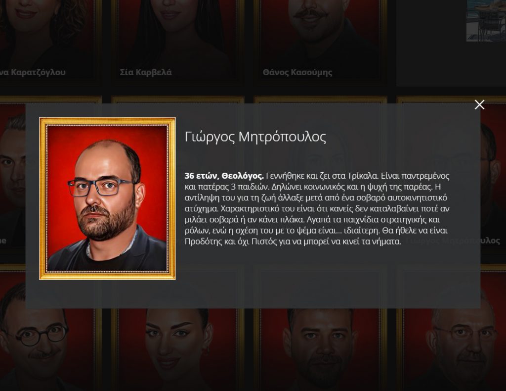 Ποιοι θα πουν το τέλειο ψέμα και θα προσπαθήσουν να υπερασπιστούν την αλήθεια τους; Ποιοι θα παραμείνουν Πιστοί και ποιοι θα φορέσουν τον μανδύα των Προδοτών; Ποιοι θα δολοφονήσουν και ποιοι θα δολοφονηθούν; Οι αποκαλύψεις έρχονται και μεταξύ των πρωταγωνιστών θα είναι και ένας Τρικαλινός. Πρόκειται για τον 36χρονο Θεολόγο Γιώργο Μητρόπουλο. Ο Γιώργος γεννήθηκε και ζει στα Τρίκαλα. Είναι παντρεμένος και πατέρας 3 παιδιών. Δηλώνει κοινωνικός και η ψυχή της παρέας. Η αντίληψη του για τη ζωή άλλαξε μετά από ένα σοβαρό αυτοκινητιστικό ατύχημα. Χαρακτηριστικό του είναι ότι κανείς δεν καταλαβαίνει ποτέ αν μιλάει σοβαρά ή αν κάνει πλάκα. Αγαπά τα παιχνίδια στρατηγικής και ρόλων, ενώ η σχέση του με το ψέμα είναι… ιδιαίτερη. Θα ήθελε να είναι Προδότης και όχι Πιστός για να μπορεί να κινεί τα νήματα.