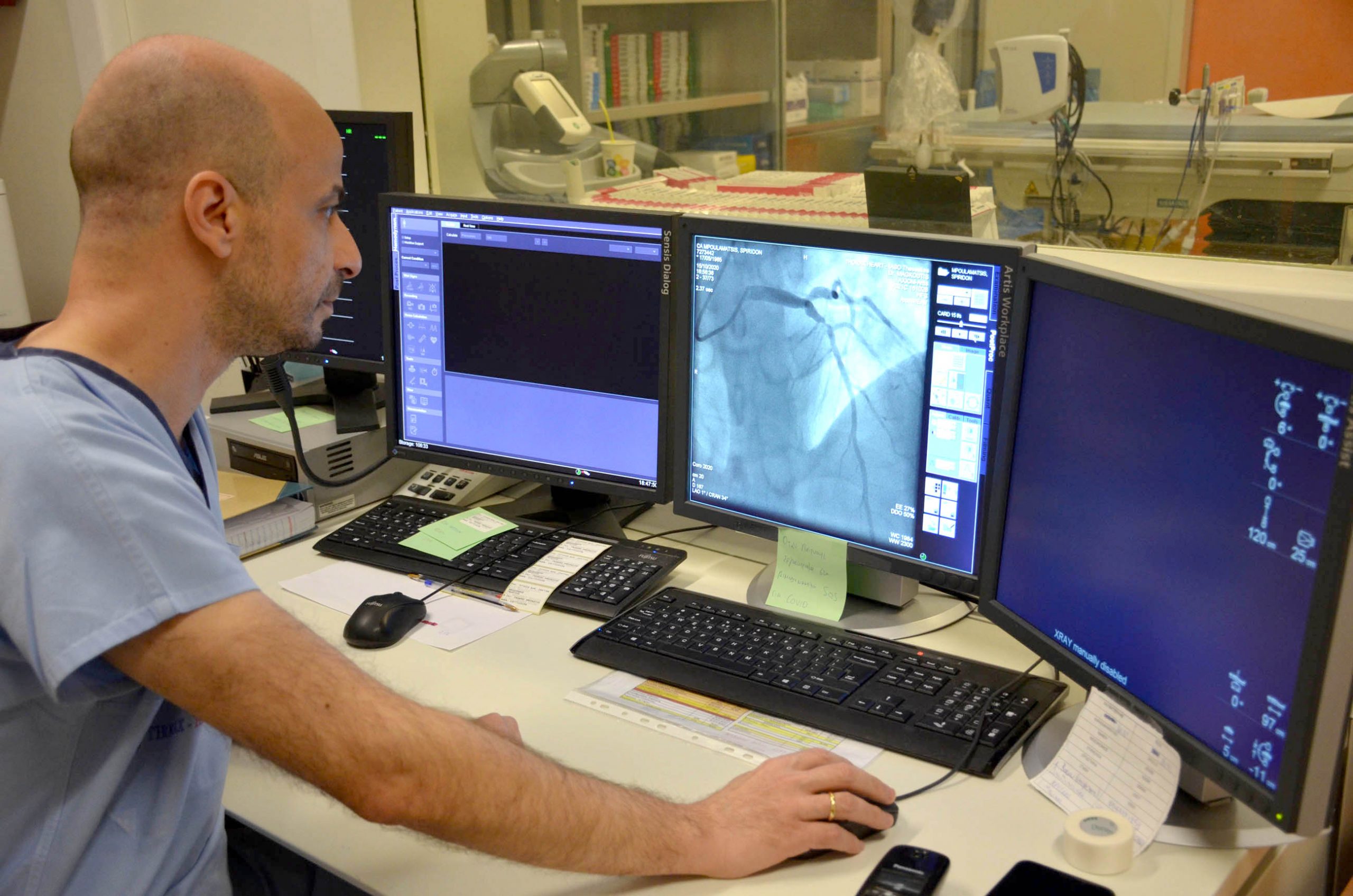 Είναι το κατάλληλα εξοπλισμένο εργαστήριο μέσα στο οποίο υπάρχει ο στεφανιογράφος, ο αγγειογράφος, μηχάνημα που μας επιτρέπει να λαμβάνουμε λήψεις των στεφανιαίων αγγείων, ουσιαστικά σκιαγραφώντας τα με ένα ειδικό σκιαγραφικό υγρό και έχουμε μια ακτινοσκόπηση της κατάστασης. Έτσι γίνεται η πρώτη εκτίμηση της κατάστασης της υγείας του ασθενούς, και, αν για παράδειγμα, φανεί πως υπάρχει μια σημαντική στένωση ενός ή περισσοτέρων αγγείων, προχωράμε κατευθείαν στην τοποθέτηση μιας ειδικής ενδοπρόθεσης, του γνωστού και ως “stent”, ώστε να παραμείνει το αγγείο ανοιχτό και να μην ξανακλείσει. Είναι μια διαδικασία η οποία έχει αντικαταστήσει το λεγόμενο «μπαλονάκι», το οποίο είχε πιθανότητες περίπου 30% να μην κρατήσει ανοιχτό για πάντα το αγγείο. Τώρα πλέον και αυτό έχει ξεπεραστεί.
