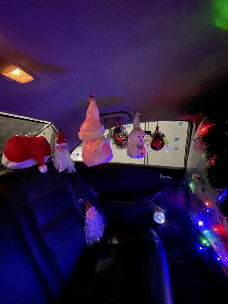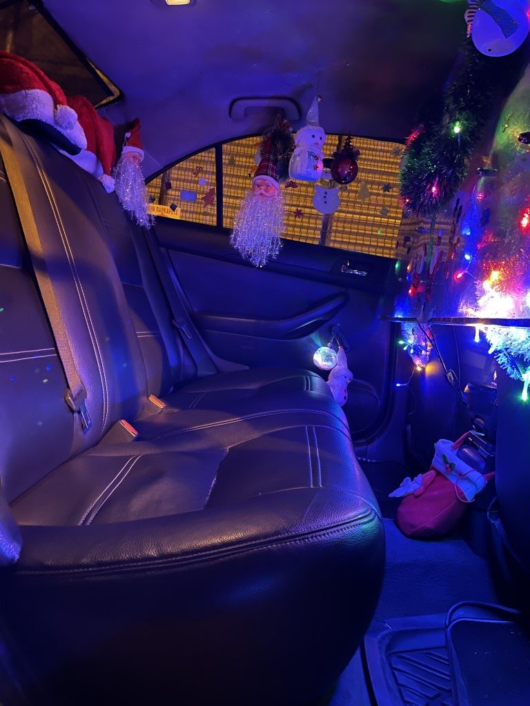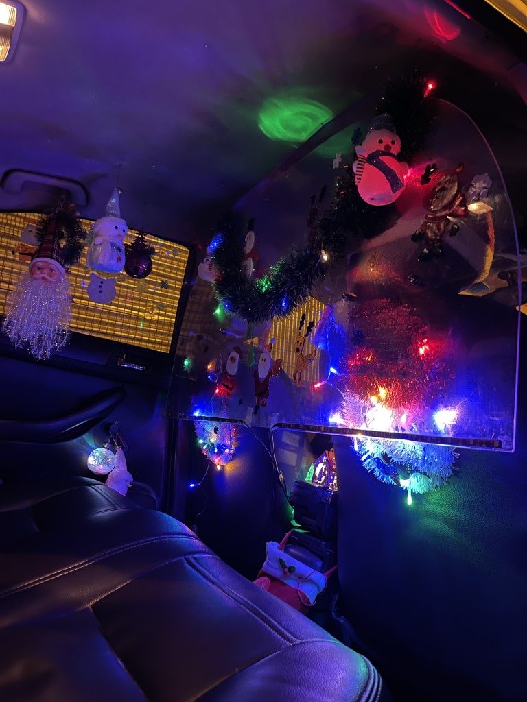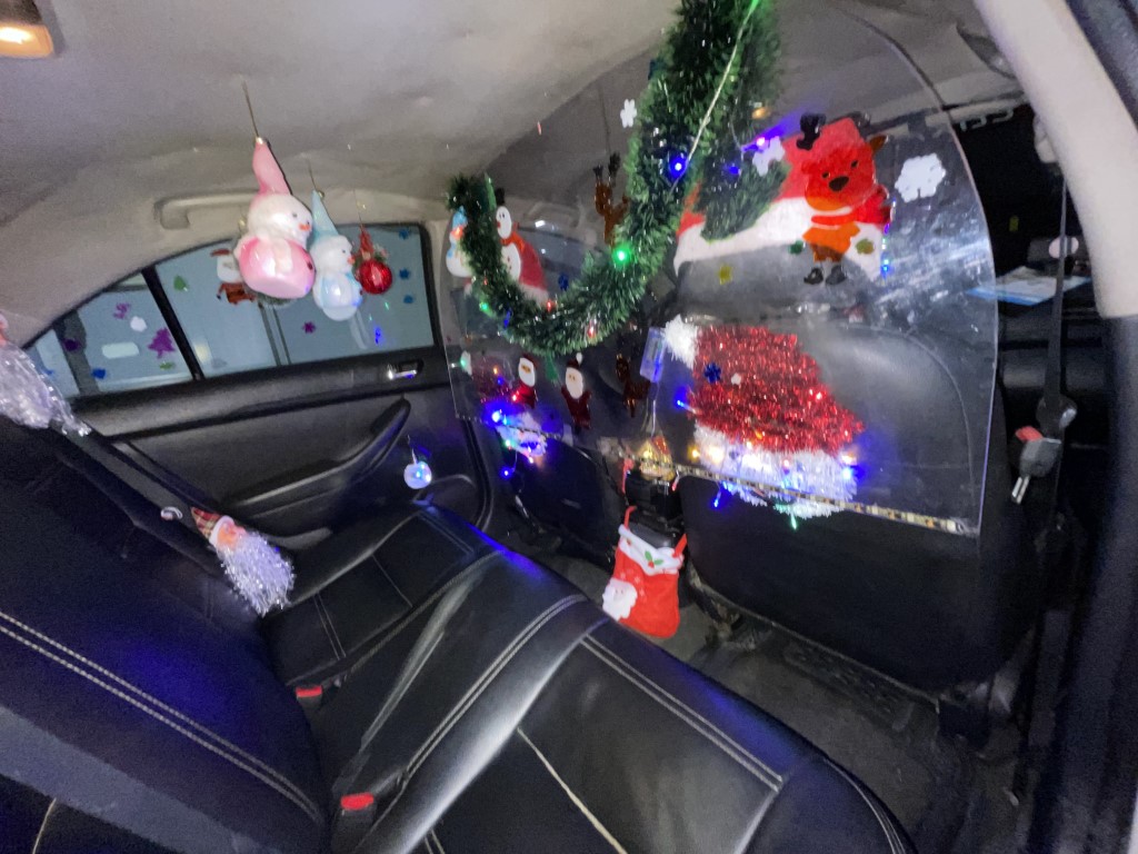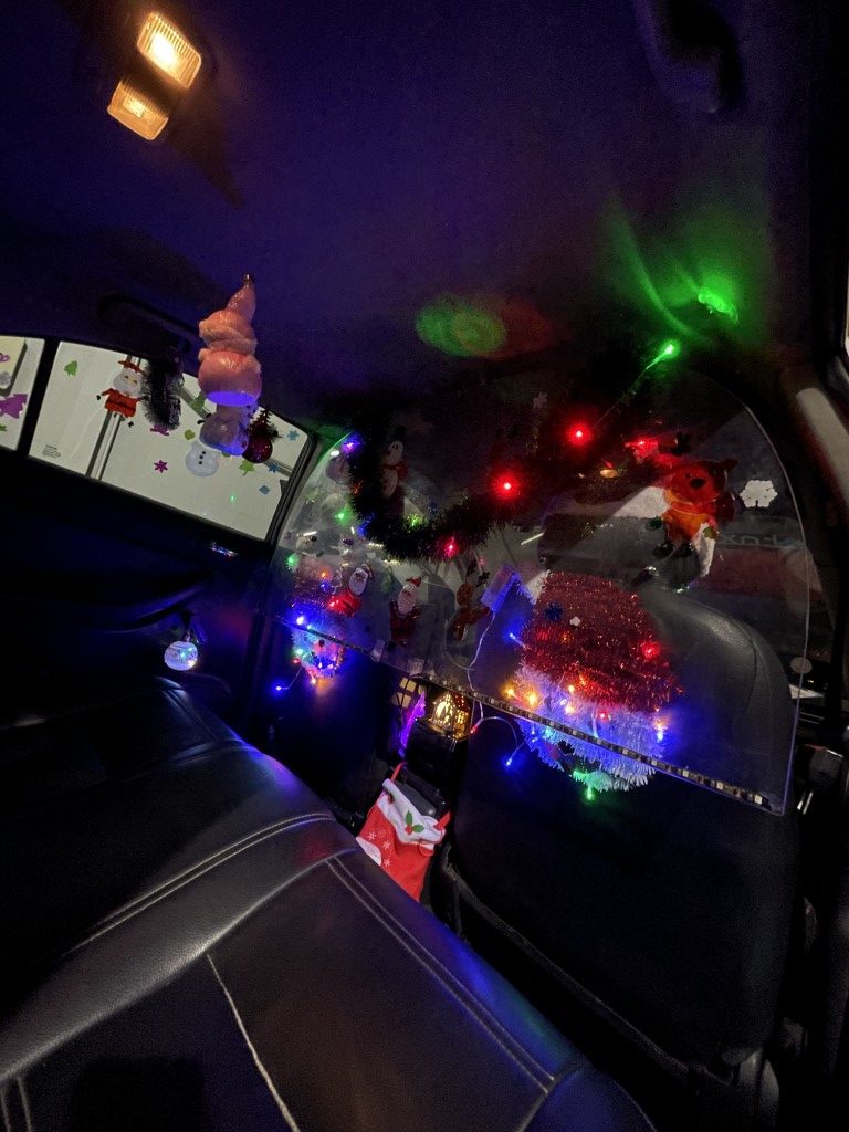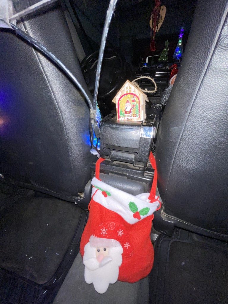 Το ΤΑΧΙ έχει μέσα γιρλάντες με λαμπάκια, Αγιοβασιλιάτικα σκουφάκια, χιονάνθρωπους με κουδουνάκια, κρέμονται λαμπάκια με διάφορες μπαλίτσες, σπιτάκια με φωτάκια, αυτοκόλλητα χριστουγεννιάτικα με τζελ καθώς και μια μπότα γεμάτη καραμέλες για να παίρνει ο κόσμος!!!… Περιττό να προσθέσουμε ότι στο ΤΑΧΙ του αυτές τις μέρες παίζει μόνο… Χριστουγεννιάτικα τραγούδια.