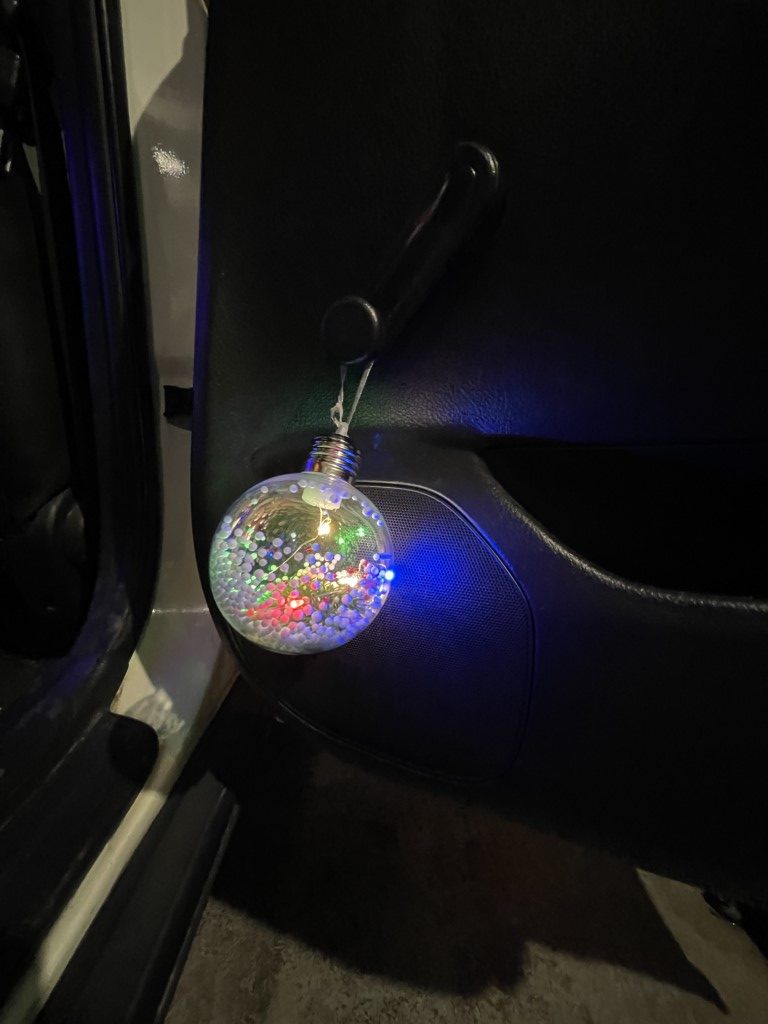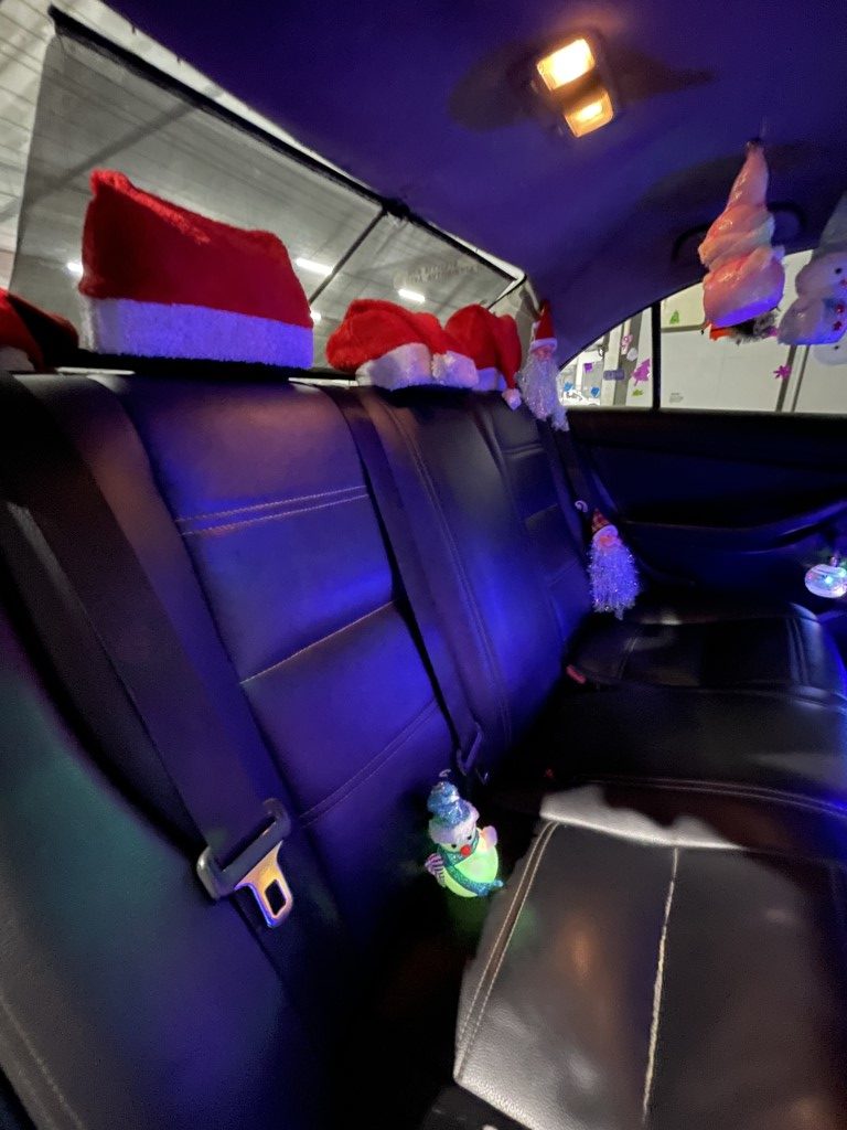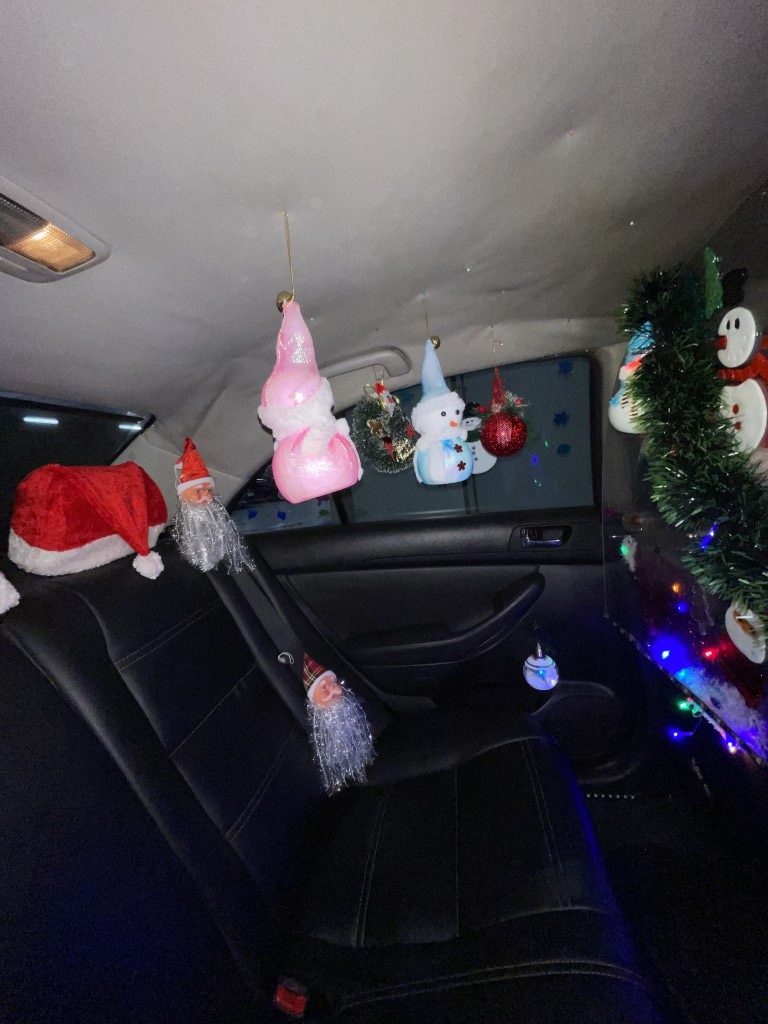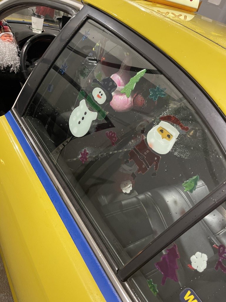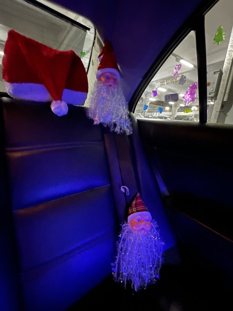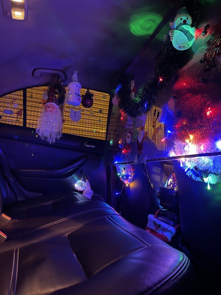 Το ΤΑΧΙ έχει μέσα γιρλάντες με λαμπάκια, Αγιοβασιλιάτικα σκουφάκια, χιονάνθρωπους με κουδουνάκια, κρέμονται λαμπάκια με διάφορες μπαλίτσες, σπιτάκια με φωτάκια, αυτοκόλλητα χριστουγεννιάτικα με τζελ καθώς και μια μπότα γεμάτη καραμέλες για να παίρνει ο κόσμος!!!… Περιττό να προσθέσουμε ότι στο ΤΑΧΙ του αυτές τις μέρες παίζει μόνο… Χριστουγεννιάτικα τραγούδια.