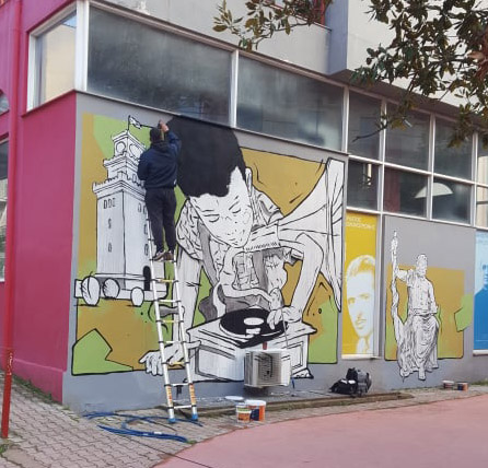 Συμμετέχοντας σε ένα πρότζεκτ της ΕΡΤ με τίτλο “η τέχνη του δρόμου” φιλοτεχνεί έξω από το Πνευματικό Κέντρο την ιστορία της πόλης, και την ντύνει με…. μουσικές!… Το αποτέλεσμα εξαιρετικό και μόλις ολοκληρωθεί θα αποτελέσει ακόμη ένα σημείο αναφοράς για την πόλη.