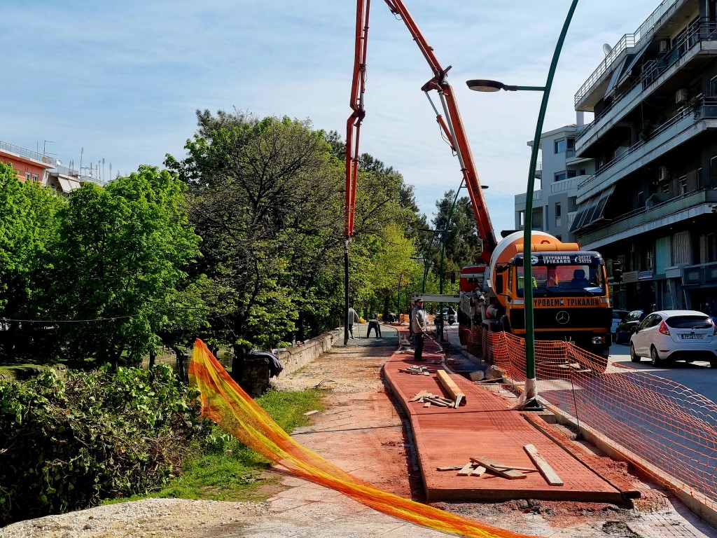 Έπειτα από παύση λίγων εβδομάδων τα έργα στην παρόχθια ζώνη του Ληθαίου “τρέχουν” ξανά και μάλιστα με ιδιαίτερα γρήγορους ρυθμούς. Όπως κατέγραψε το trikalavoice.gr το πρωί της Μ. Τετάρτης έπεσε τσιμέντο, αλλά και το ειδικό υλικό για τον ποδηλατόδρομο επί της οδού Κανούτα. Υπενθυμίζεται ότι ήδη έχουν παραδοθεί τα τμήματα στο πρώτο κομμάτι της Όθωνος και της Ιακωβάκη.