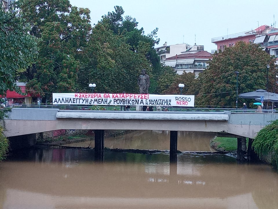 Πάνο στην πεζογέφυρα του Ληθαίου ποταμού σήκωσαν σήμερα το πρωί, τα μέλη του Αυτοδιαχειριζόμενου Κοινωνικού Χώρου Rossonero, εκφράζοντας την αλληλεγγύη τους στα μέλη του Ρουβίκωνα Γ. Καλαϊτζίδη και Ν. Ματαράγκα ενόψει της δίκης την Τετάρτη 13 Οκτωβρίου στο εφετείο Αθηνών.