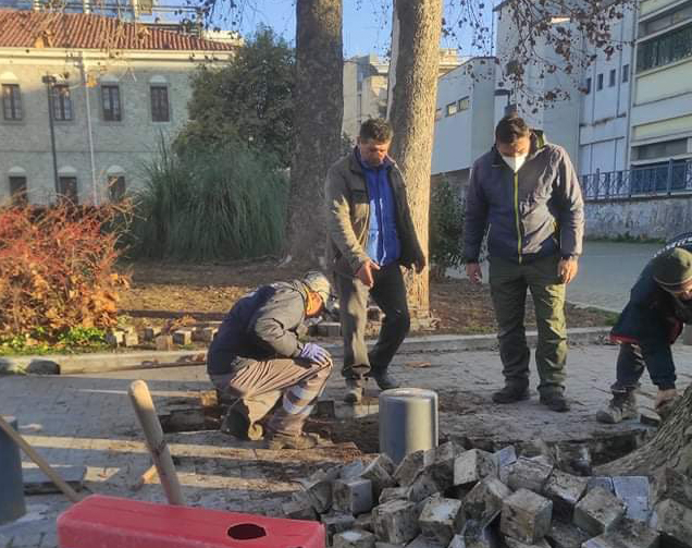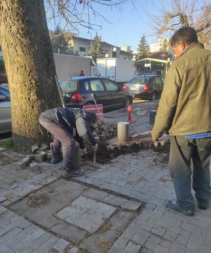 Μικρής κλίμακας αλλά μεγαλύτερης σημασίας, οι παρεμβάσεις του Δήμου Τρικκαίων. Η πρώτη αφορά στην προστασία των δέντρων και των πεζών στο πεζοδρόμιο μπροστά από τα Δικαστήρια. Λόγω της επέκτασης των ριζών, αρκετοί κυβόλιθοι αφαιρέθηκαν, δημιουργώντας προβλήματα στους πεζούς. Προκειμένου να προστατευθούν τα δέντρα και το ριζικό τους σύστημα, αλλά και να γίνεται ανεμπόδιστα η κυκλοφορία των πεζών, ο Δήμος Τρικκαίων επέκτεινε το πλαίσιο προστασίας των δέντρων, αντικαθιστώντας και τα σημεία από τα οποία αφαιρέθηκαν οι κυβόλιθοι.